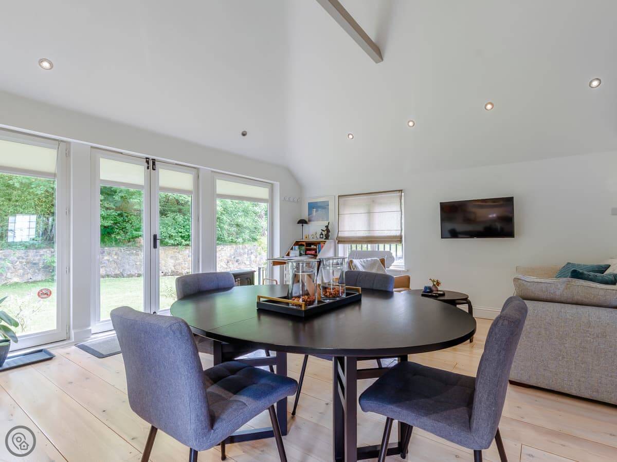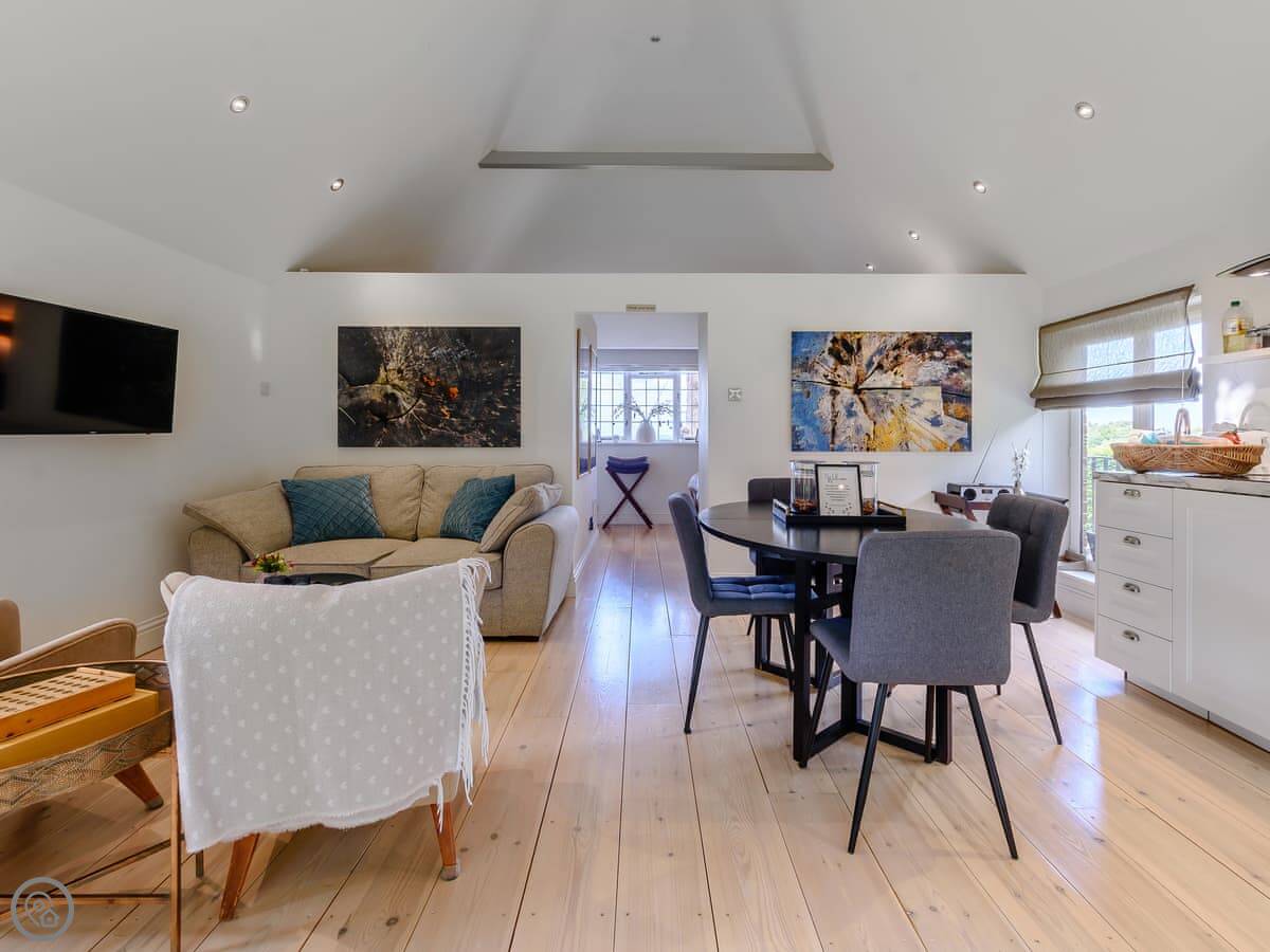 Inside, it's an open-plan living, dining, and kitchen area. The bedroom has a double bed. There's one bathroom with a shower. Everything you'd expect is included: bed linen, towels, WiFi, TV, washing machine.