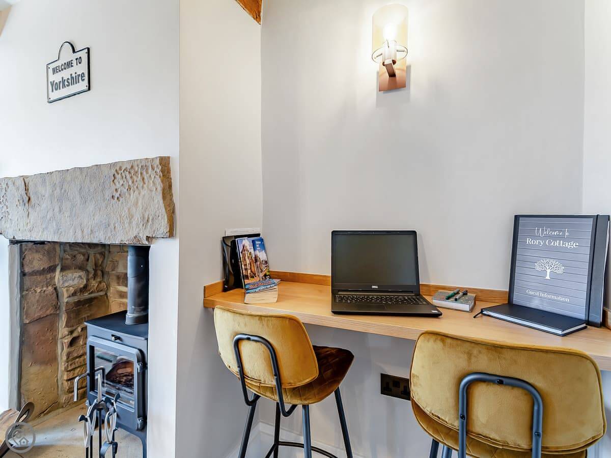 Inside, there's a wood-burning stove in the lounge and a large TV. The kitchen has a dishwasher and washing machine. The bathroom has a walk-in shower.