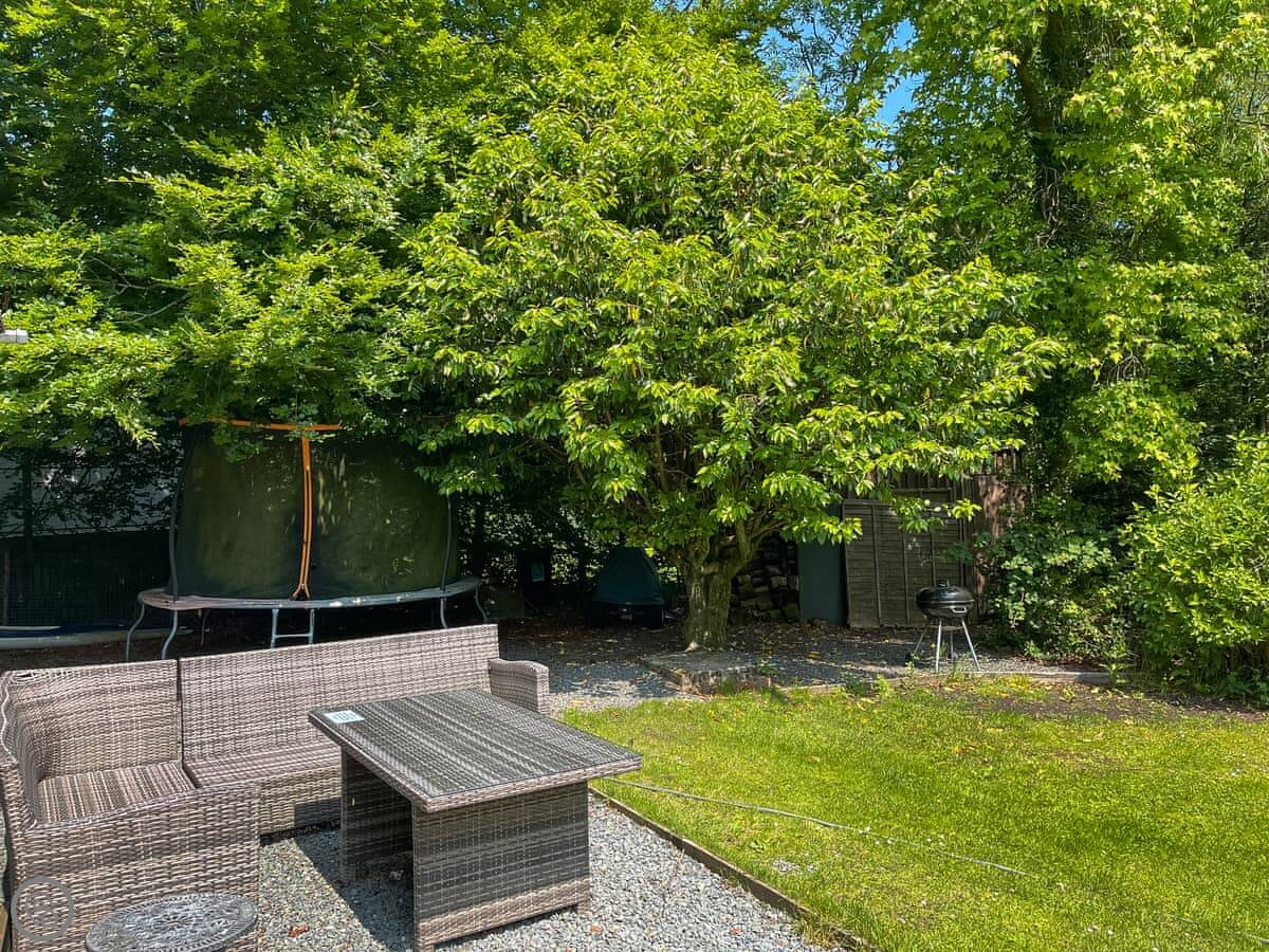 The garden has a hot tub, a trampoline, and a few seating areas. It's enclosed.