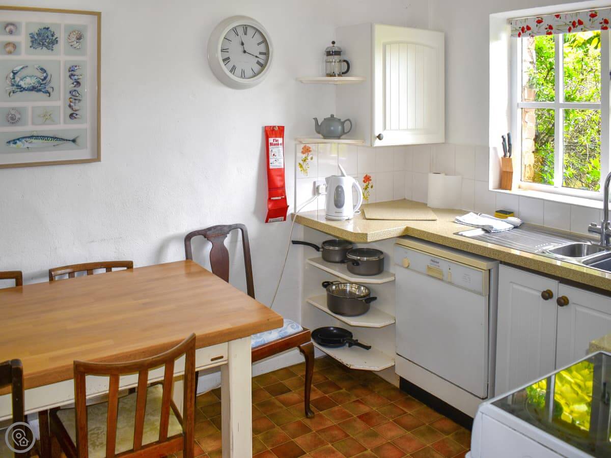 Inside, it's got a washing machine, dishwasher, WiFi, and a TV. Bedding and towels are included. There's a cot if you need it. You can bring up to two dogs.