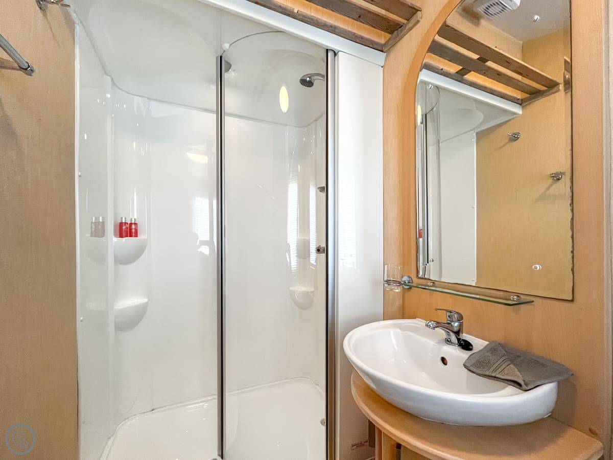 The caravan sleeps four. Two bedrooms, two bathrooms. It's got a 4 Star rating, which is good for this type of accommodation. Everything's modern and clean. The decking at the front is glass enclosed, so you can sit out there even if it's a bit breezy. You get a good view.
