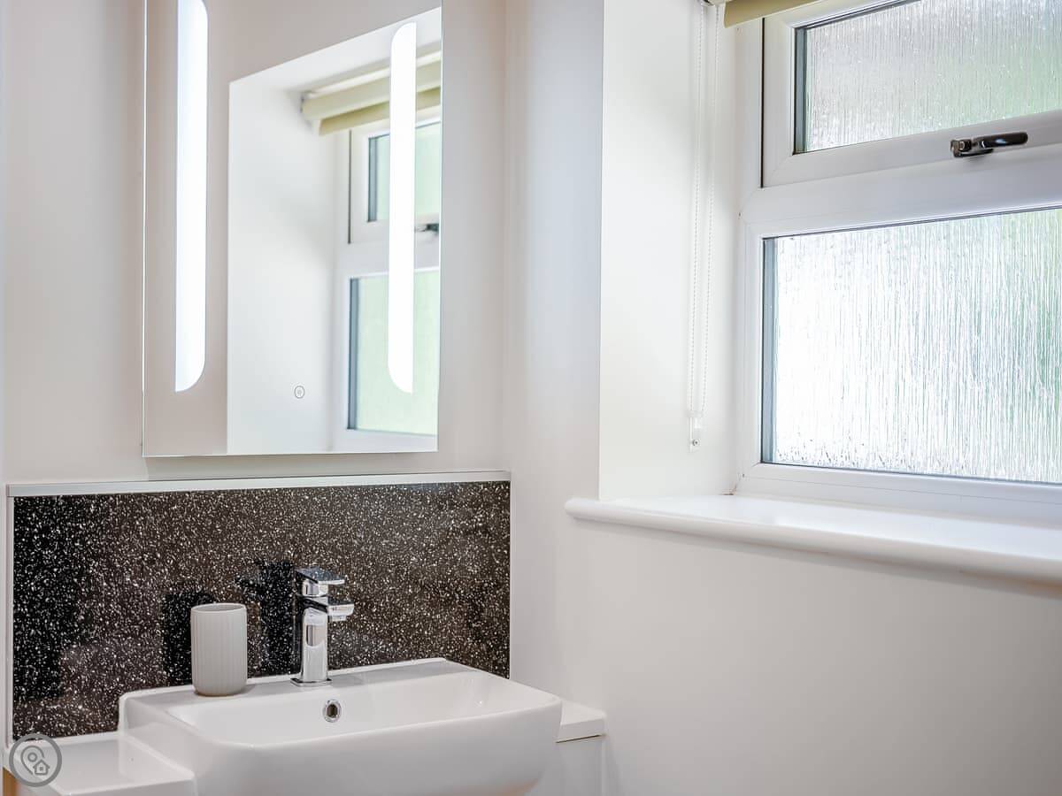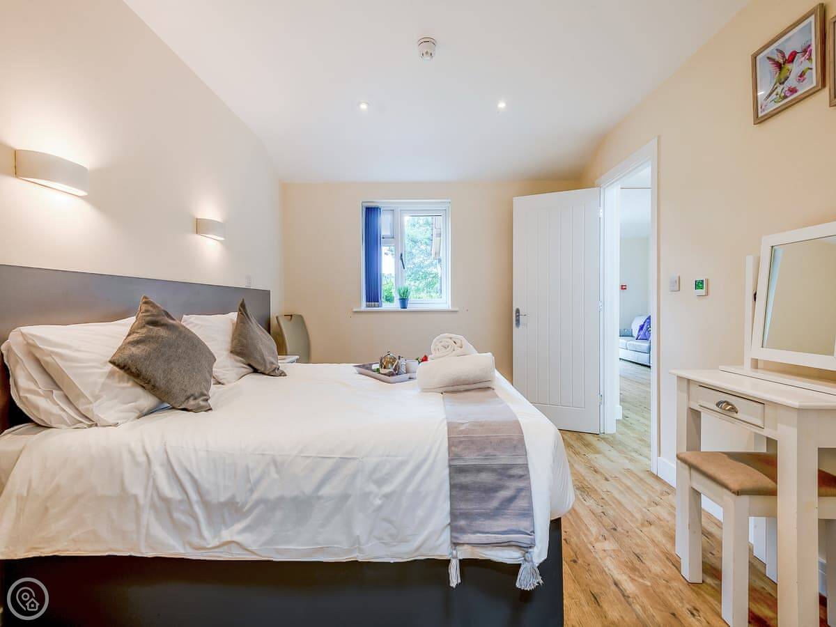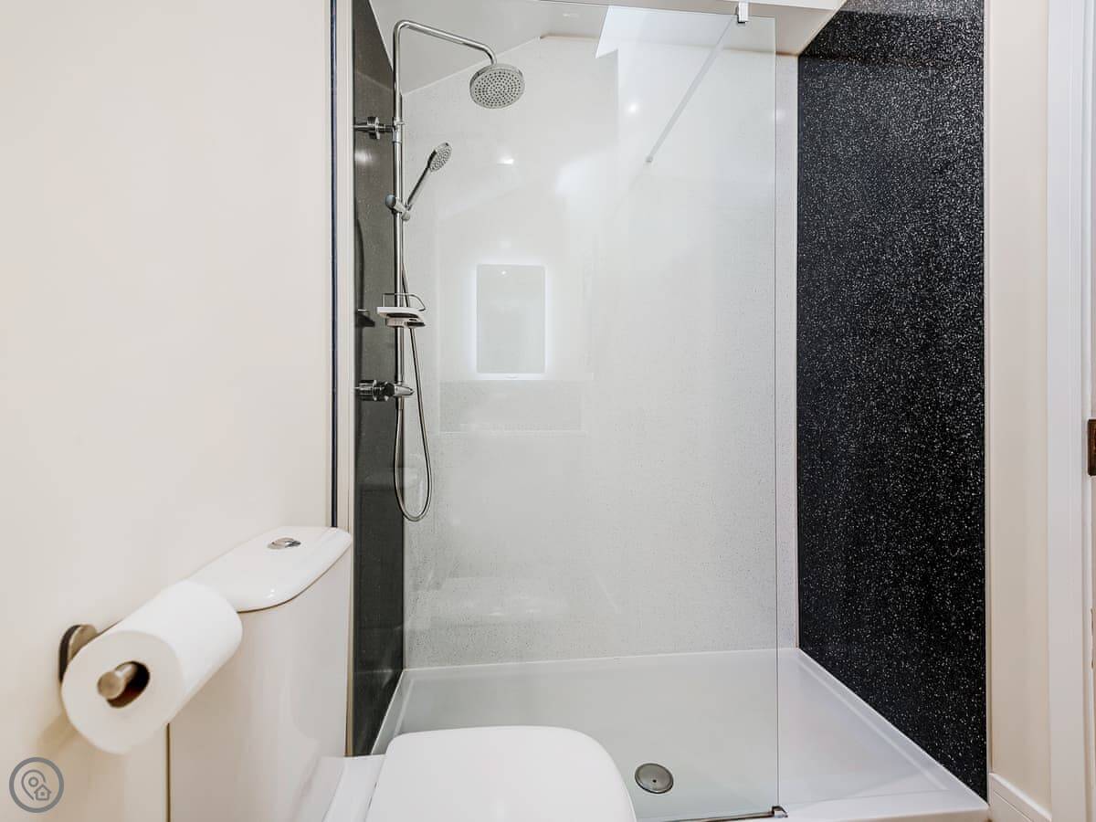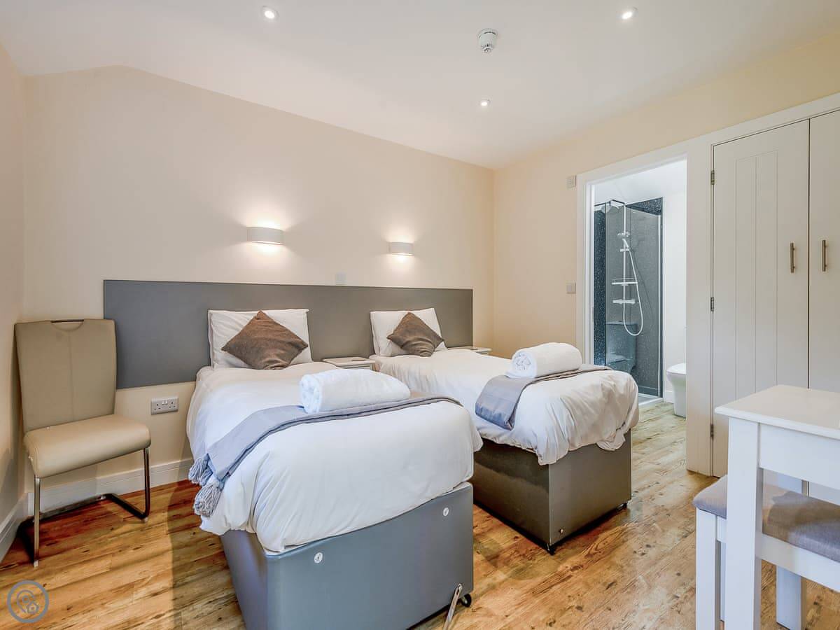 It sleeps six. There are two bedrooms, each with its own bathroom. The open plan living area has a sofa bed as well. It's got a 4 Star rating. It was renovated a few years ago so it's modern inside, with underfloor heating.