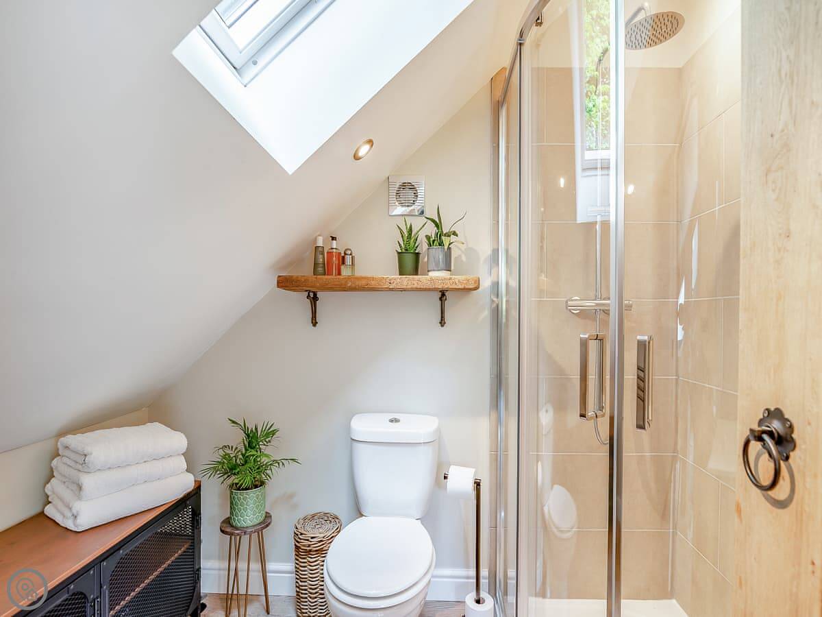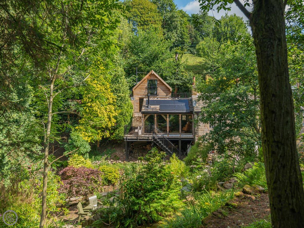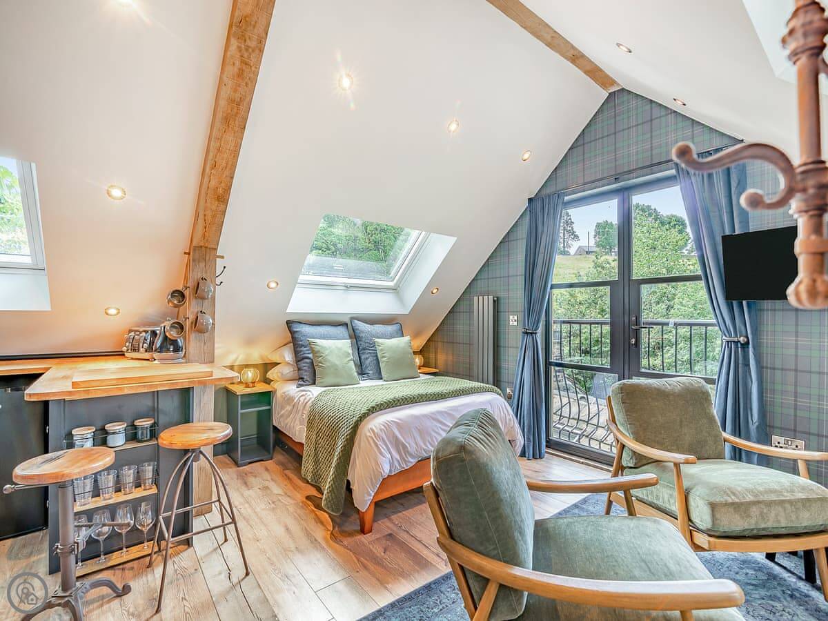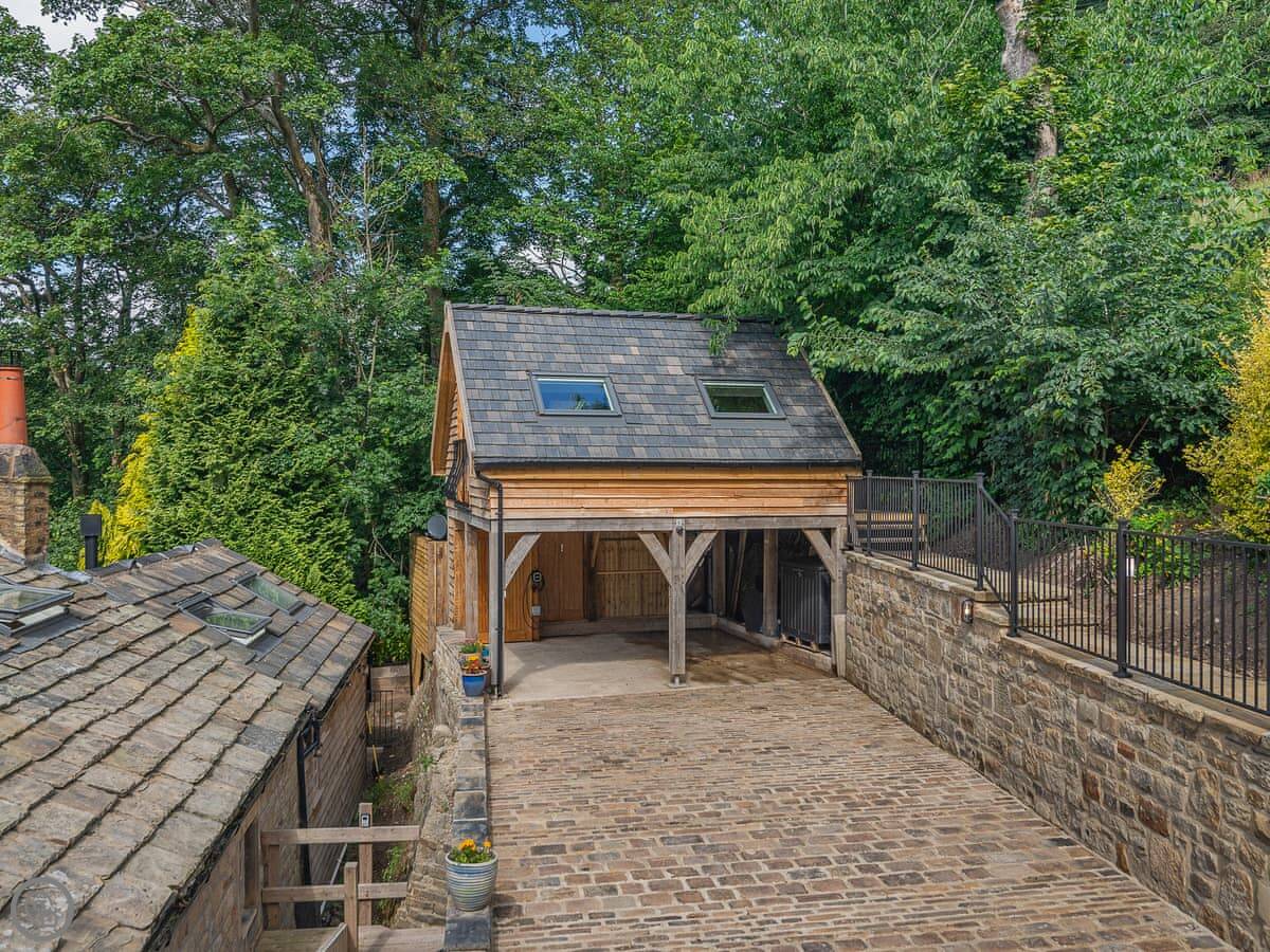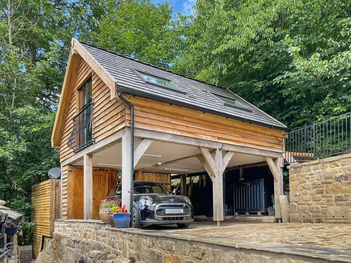 The Woodland Loft is in Hebden Bridge. It's a one-bedroom place for two people, built on top of an oak-framed parking bay. You get a parking space underneath. It's a 5 Star property, which means it's finished to a high standard.
