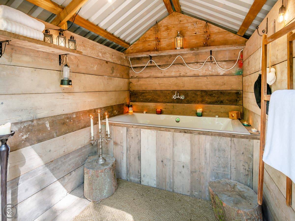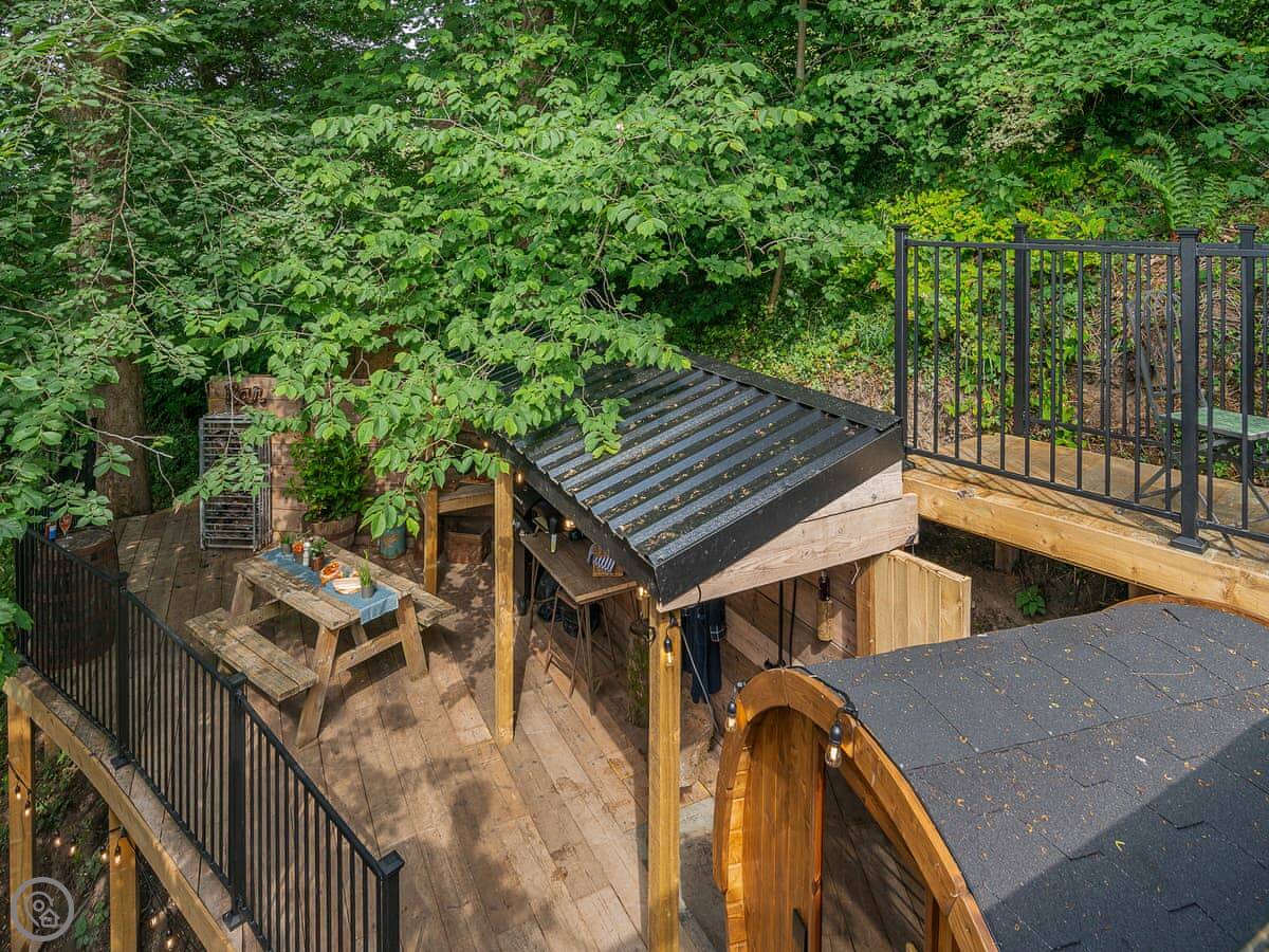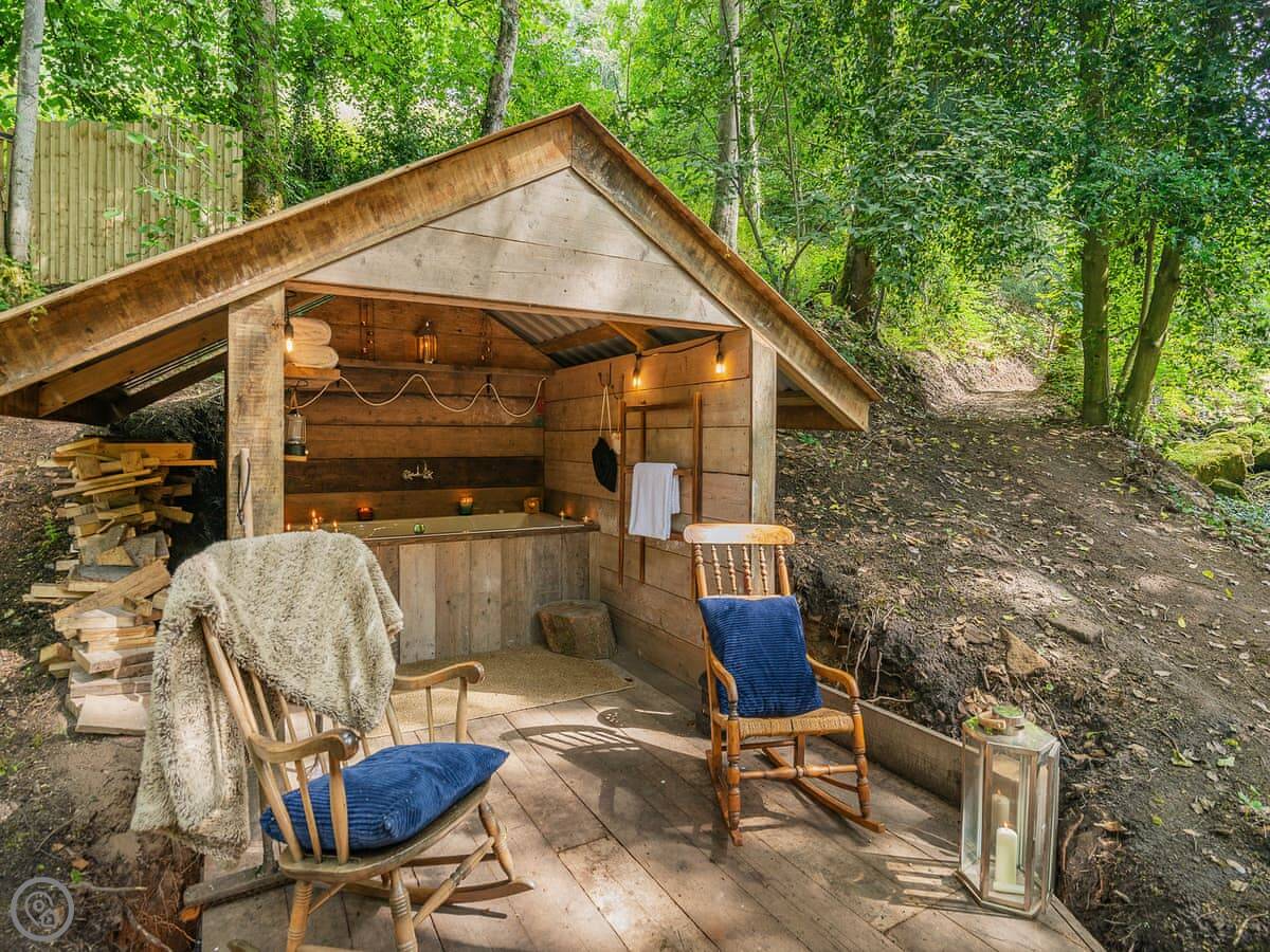 Outside, there's a deck. There's also a sauna and an outdoor shower. Further down the garden, through a gate, there's a path that leads to a wooden hut in the woods. Inside the hut is a big bath for two. The path to it and the steps down to the hut are steep and uneven, so it's not suitable if you have trouble with mobility.