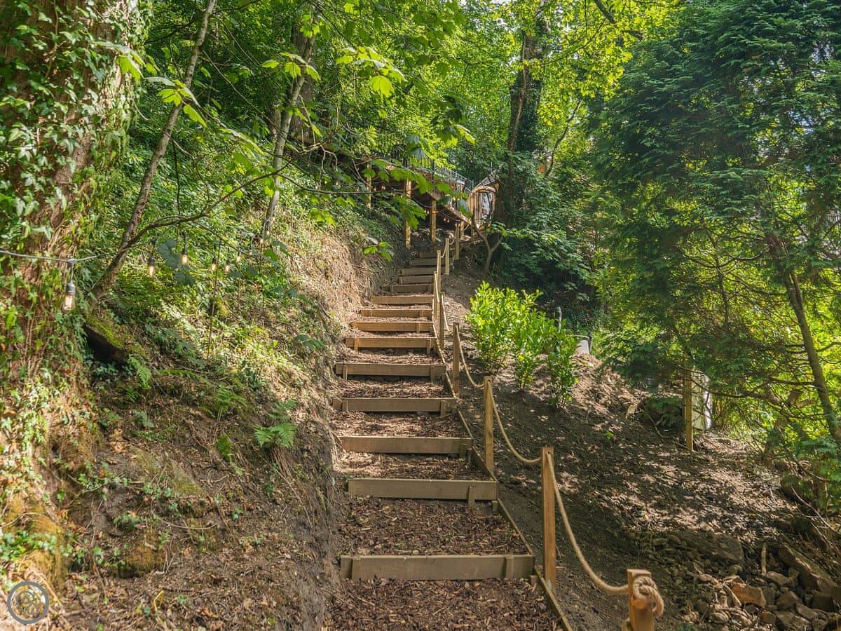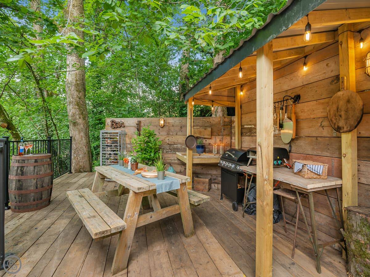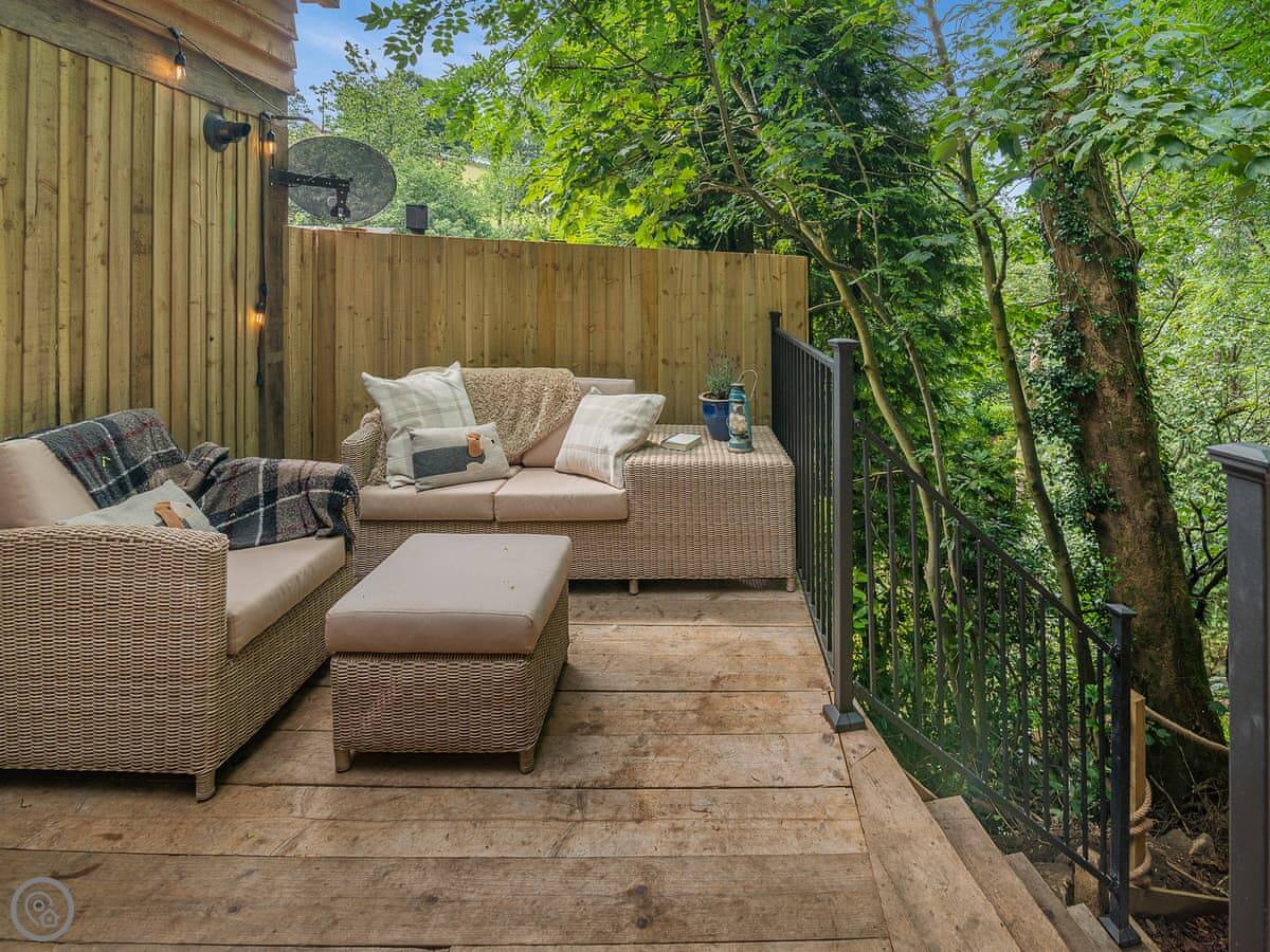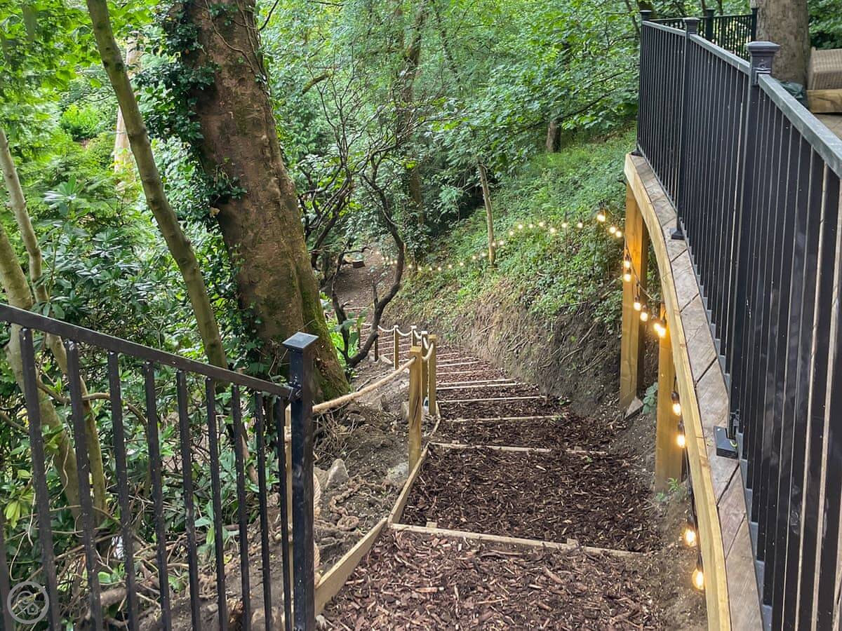 Outside, there's a deck. There's also a sauna and an outdoor shower. Further down the garden, through a gate, there's a path that leads to a wooden hut in the woods. Inside the hut is a big bath for two. The path to it and the steps down to the hut are steep and uneven, so it's not suitable if you have trouble with mobility.