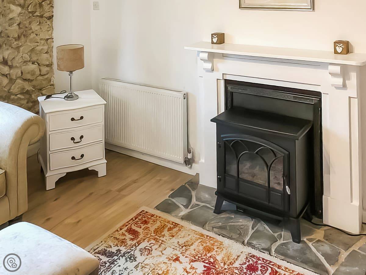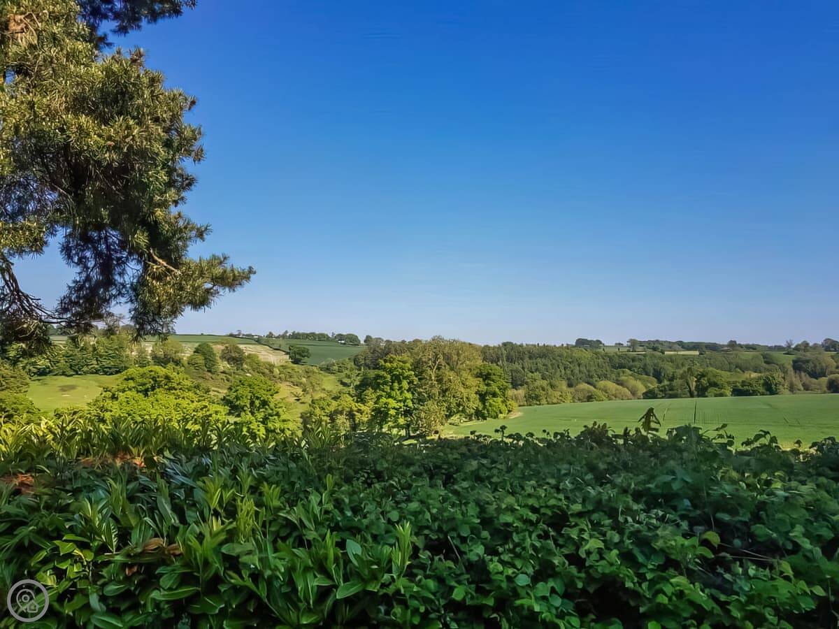 Downstairs is mostly one room: the living area and kitchen together. The kitchen doors open out to a small private patio and garden, which gets the sun. The real space is the grounds. There are about eight acres you can walk around. There's a walled garden, some woodland, and two ponds. One has a fire pit next to it. You can use the Orangery in the walled garden for sitting in.