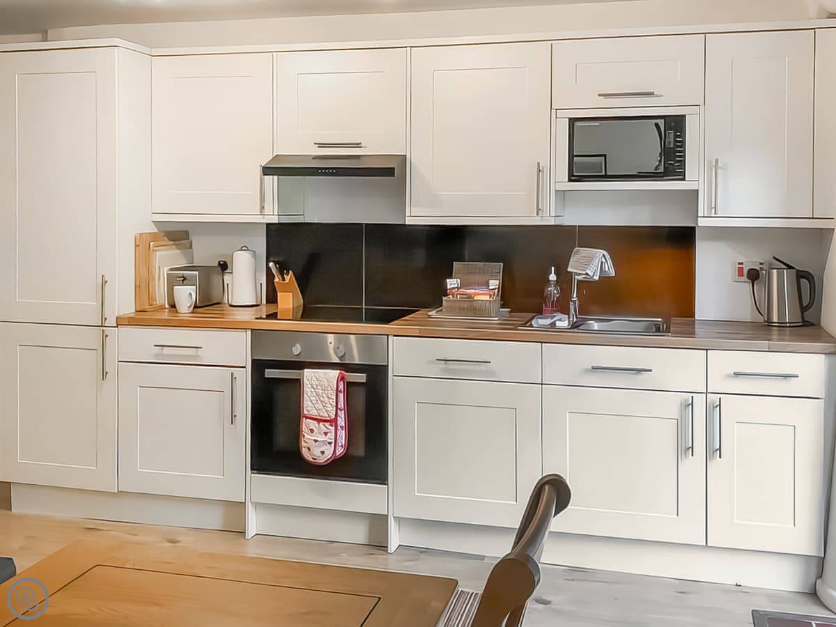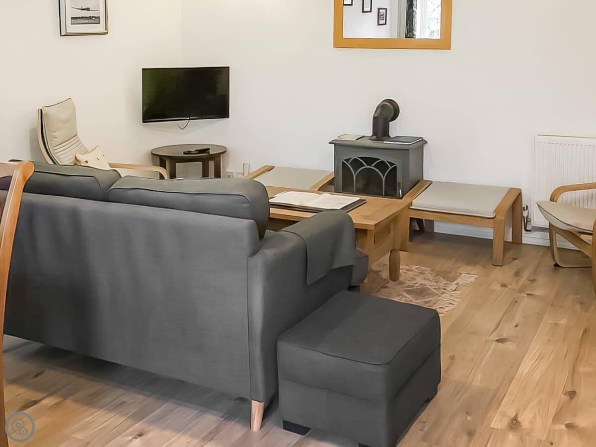 Inside, it's open plan. Kitchen, dining, living area all together. There's an electric wood burner for atmosphere. It's got a 4 Star rating. It's comfortable, not palatial. The facilities are what you'd need: washing machine, dishwasher, WiFi, TV. There's parking and an electric vehicle charger.
