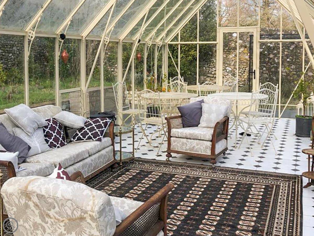 It's got a 4 Star rating. That means it's well put together and comfortable. The inside is open plan, so it's all one room for the kitchen, dining and sitting area. There's exposed stonework. French doors open straight out onto a patio.