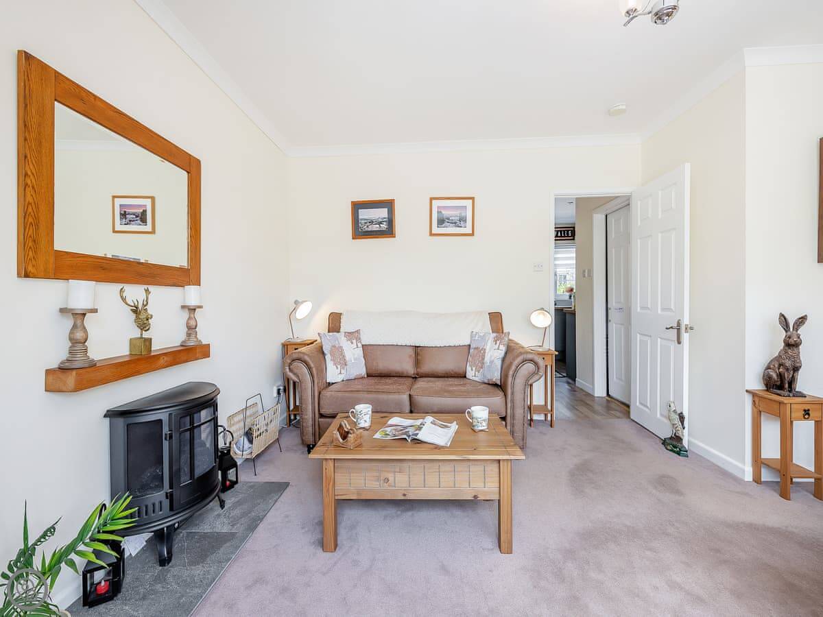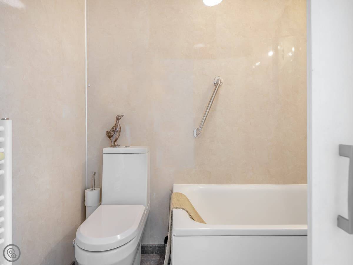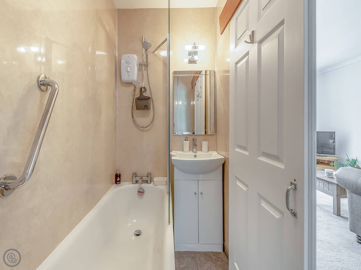 Inside, it's all on one level. There's a grab rail in the shower. The kitchen is small but it's got an oven, hob, and fridge. Bedding and towels are included. There's a TV and the WiFi is okay.