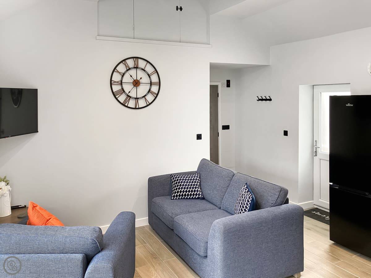 It's open plan inside, kitchen and living area together. There's a patio garden with a table and chairs, looks out over fields.