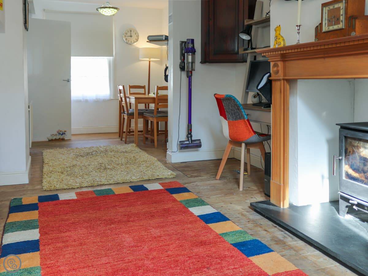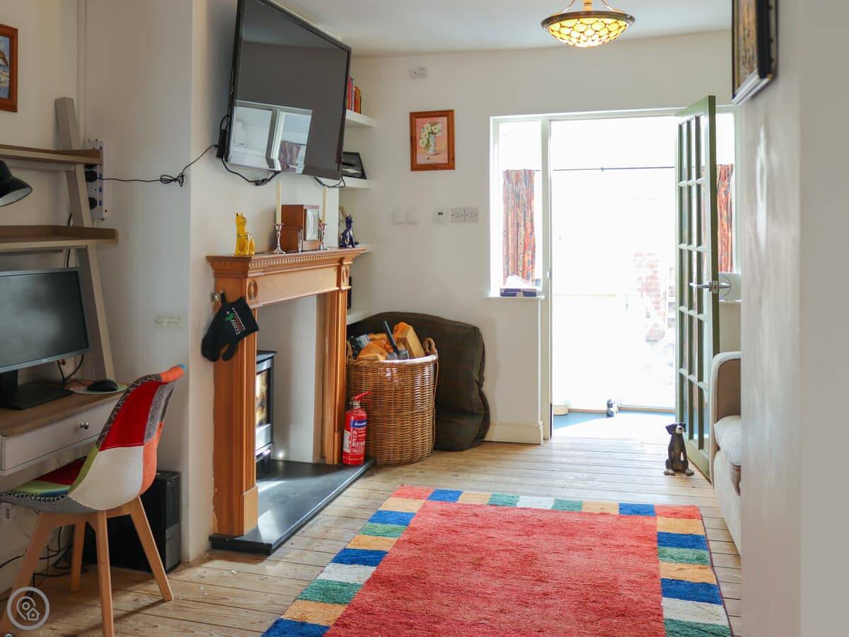 The living room has a wood burner. It works well. The kitchen has a door that opens to a small yard outside. There's a table and chairs out there. It's a sunny spot in the morning.