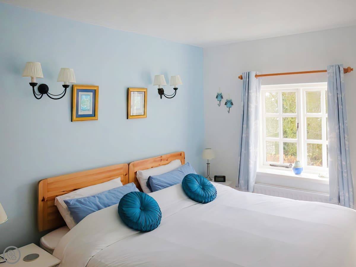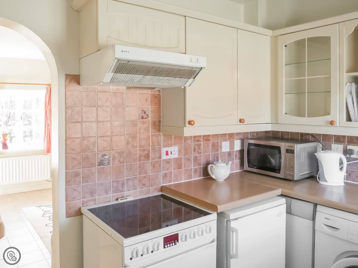 Inside, there's one bedroom with a super king-size bed. We can split it into two singles if you let us know beforehand. There's one bathroom with a shower over the bath. The living area has a TV and there's fibre broadband. The kitchen has what you'd expect: dishwasher, washing machine, that sort of thing.