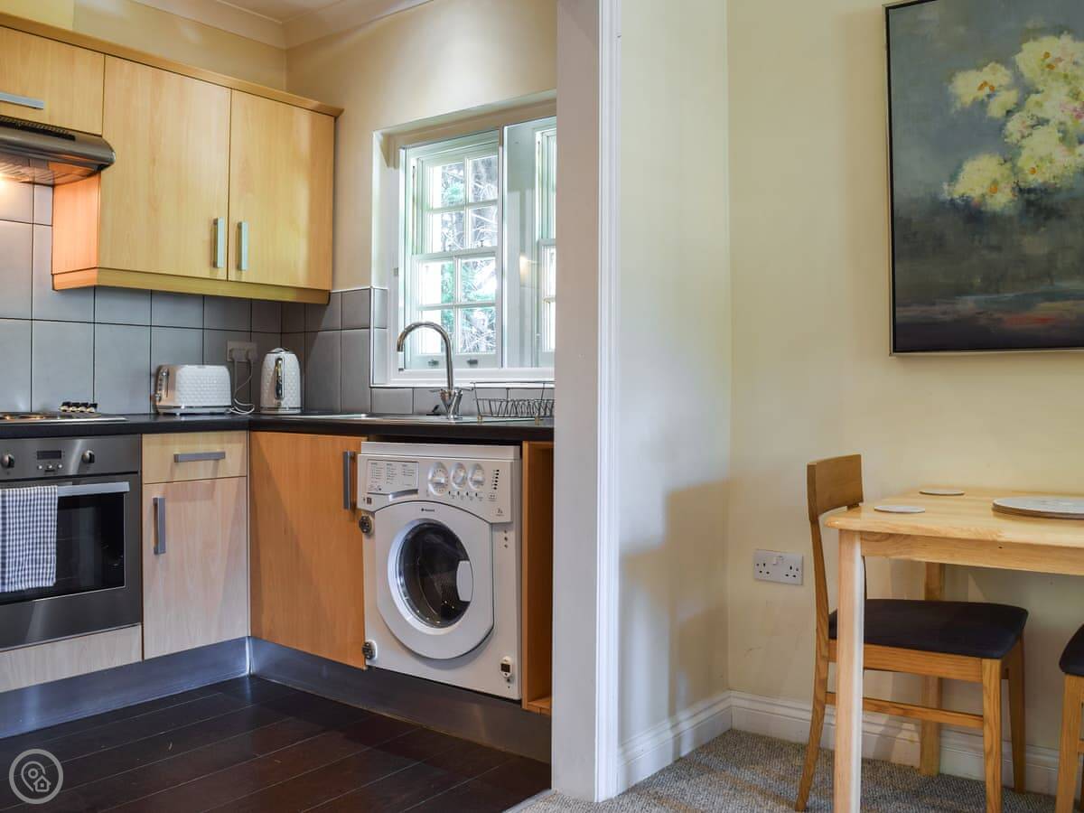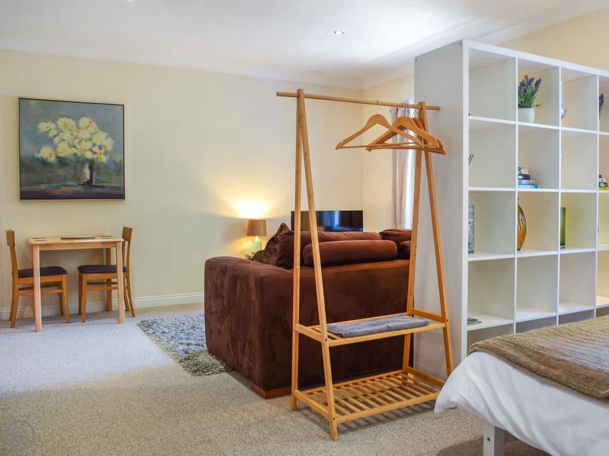 It’s got a 4 Star rating, which means it’s comfortable and well-equipped. The space is all open plan, so the bed, kitchen, and sitting area are in one room. There’s a separate bathroom. The stairs up to it are external and a bit steeper than a normal house.