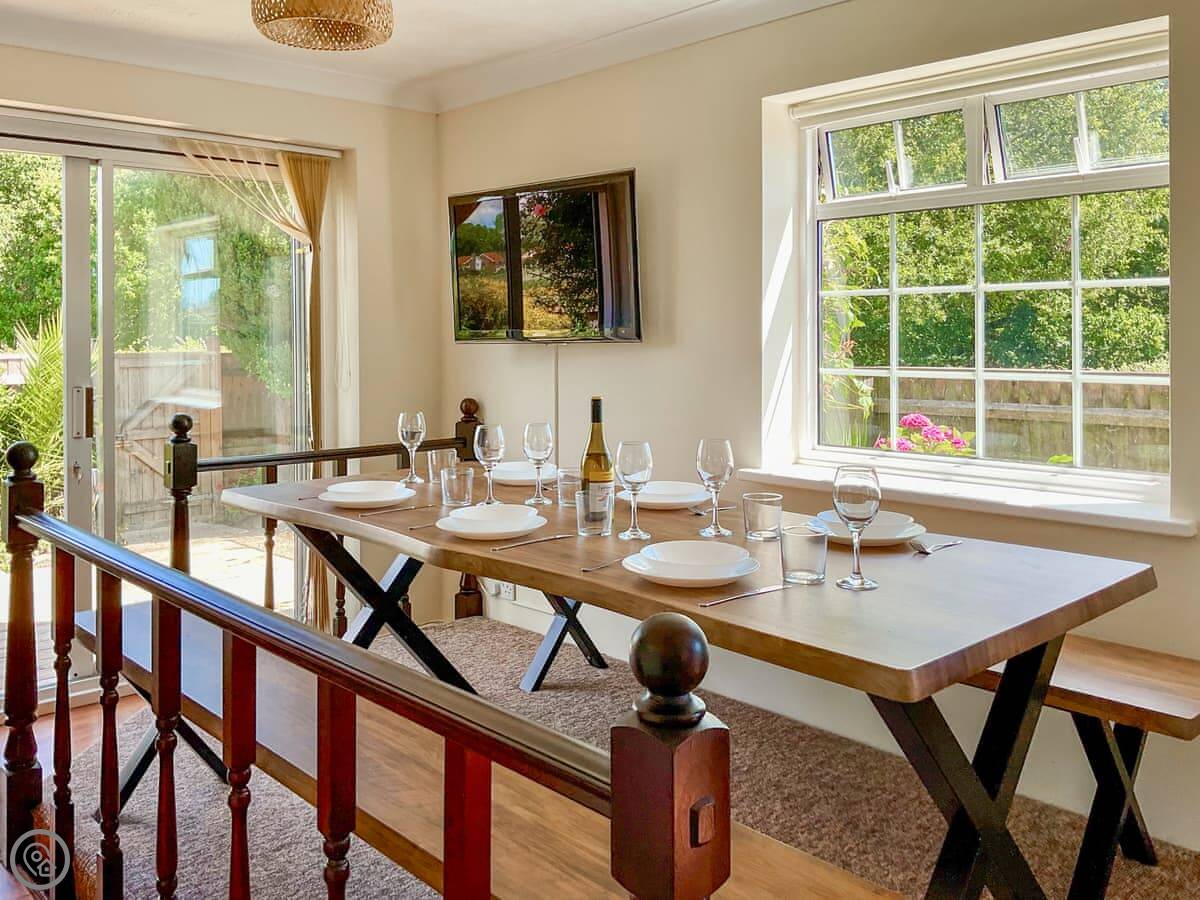 Inside, it's open plan downstairs. Kitchen, dining area, living space all together. It works well for a group. The stairs are fine. There's parking on the drive.