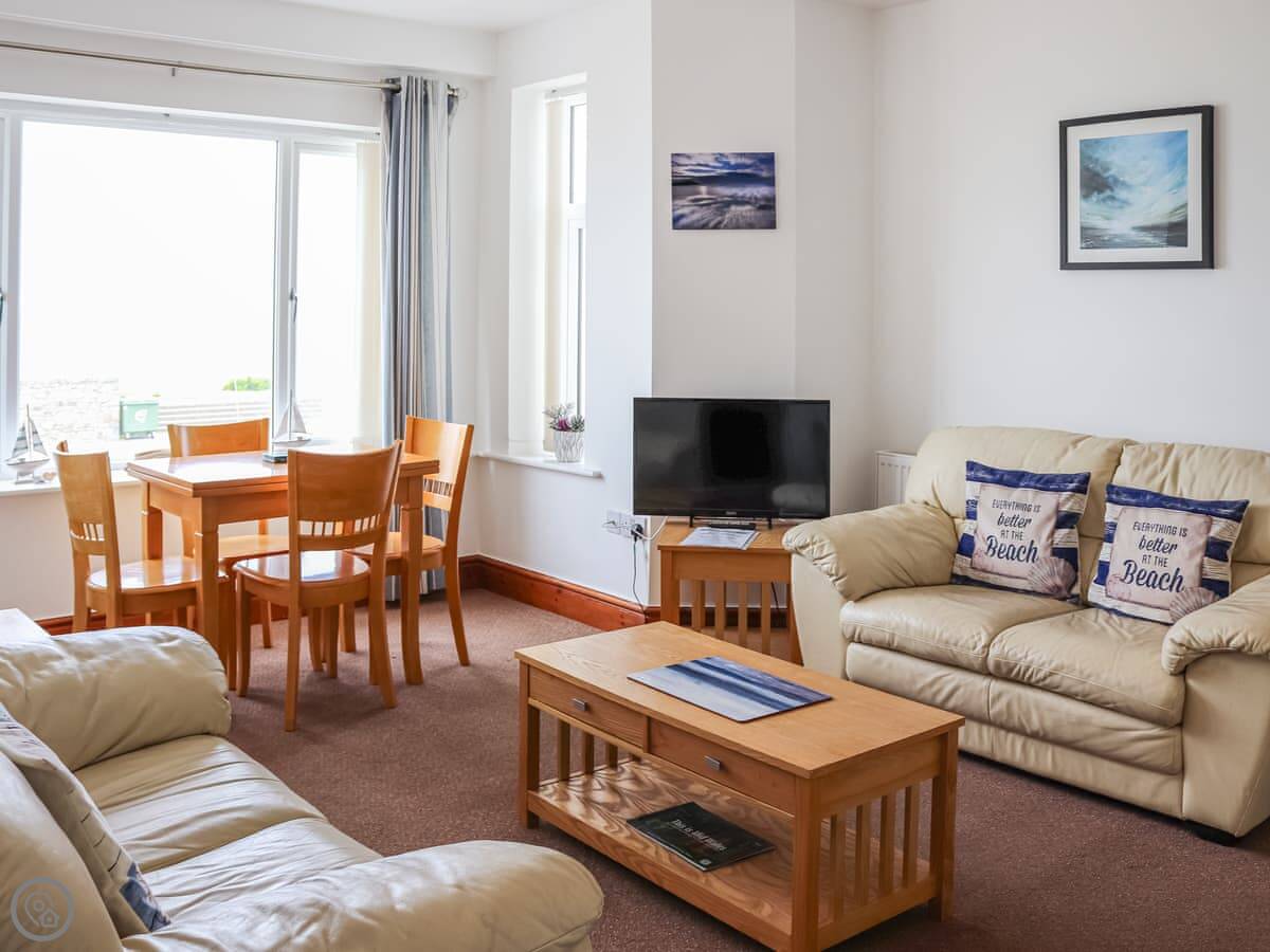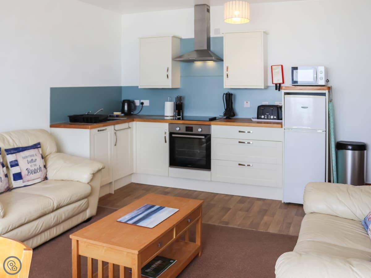 The living area is open plan, kitchen and sofa. There's a second, smaller sitting room too, with the doors to the balcony. Good if someone wants to read while the telly is on.
