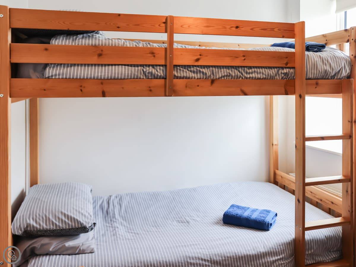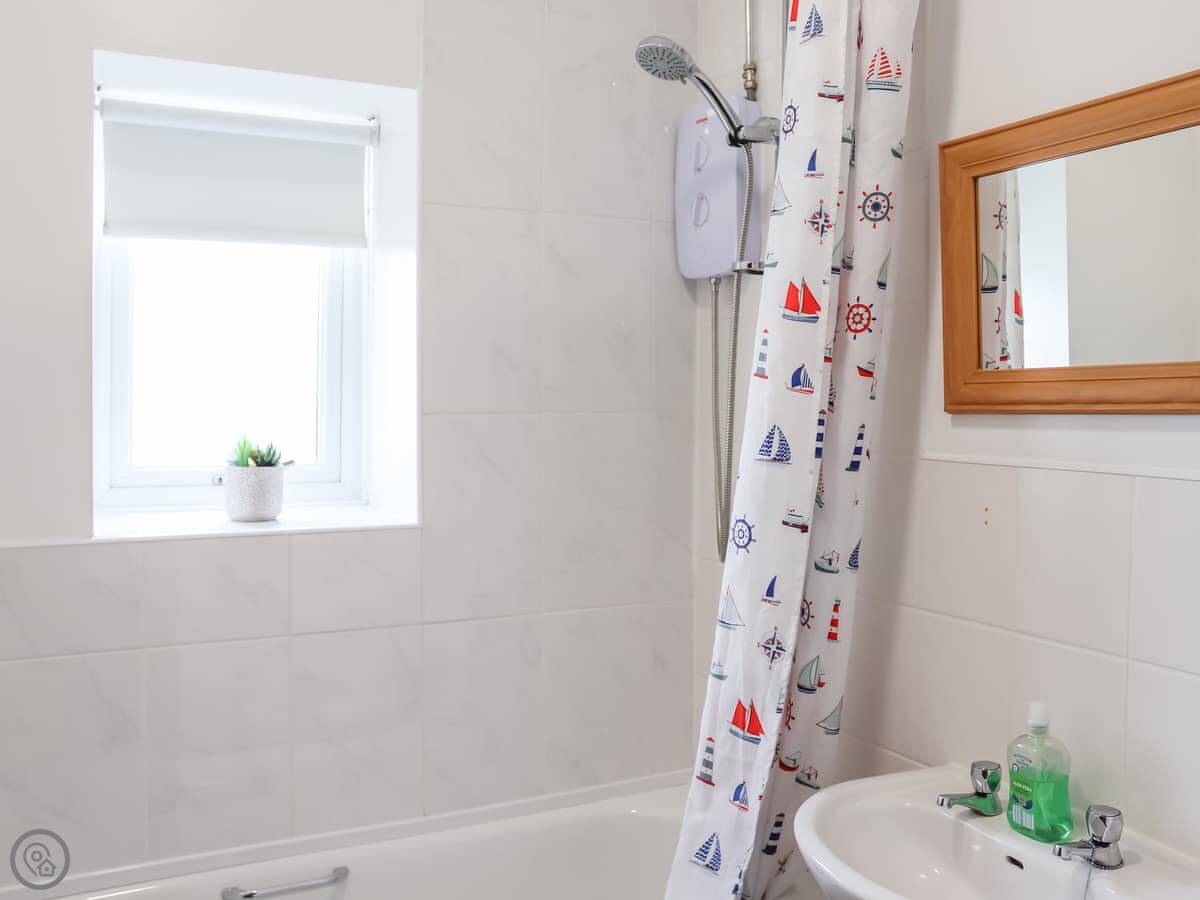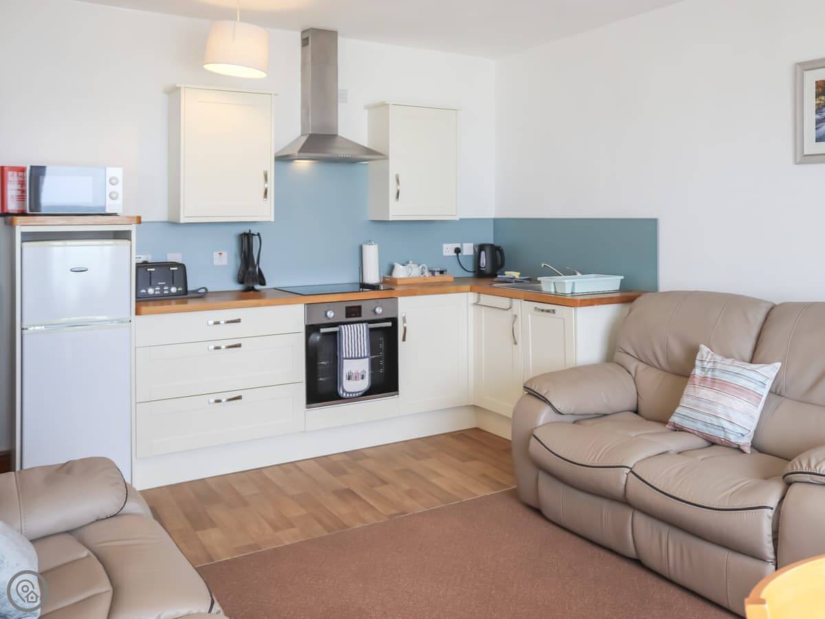 It sleeps four. Two bedrooms, one bathroom with a shower over the bath. It's got a 4 Star rating. It's clean, modern and straightforward. The kitchen is open plan with the living area. There's a shared garden too, which is quite big.
