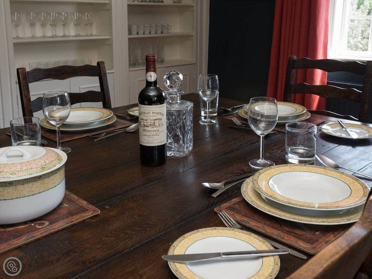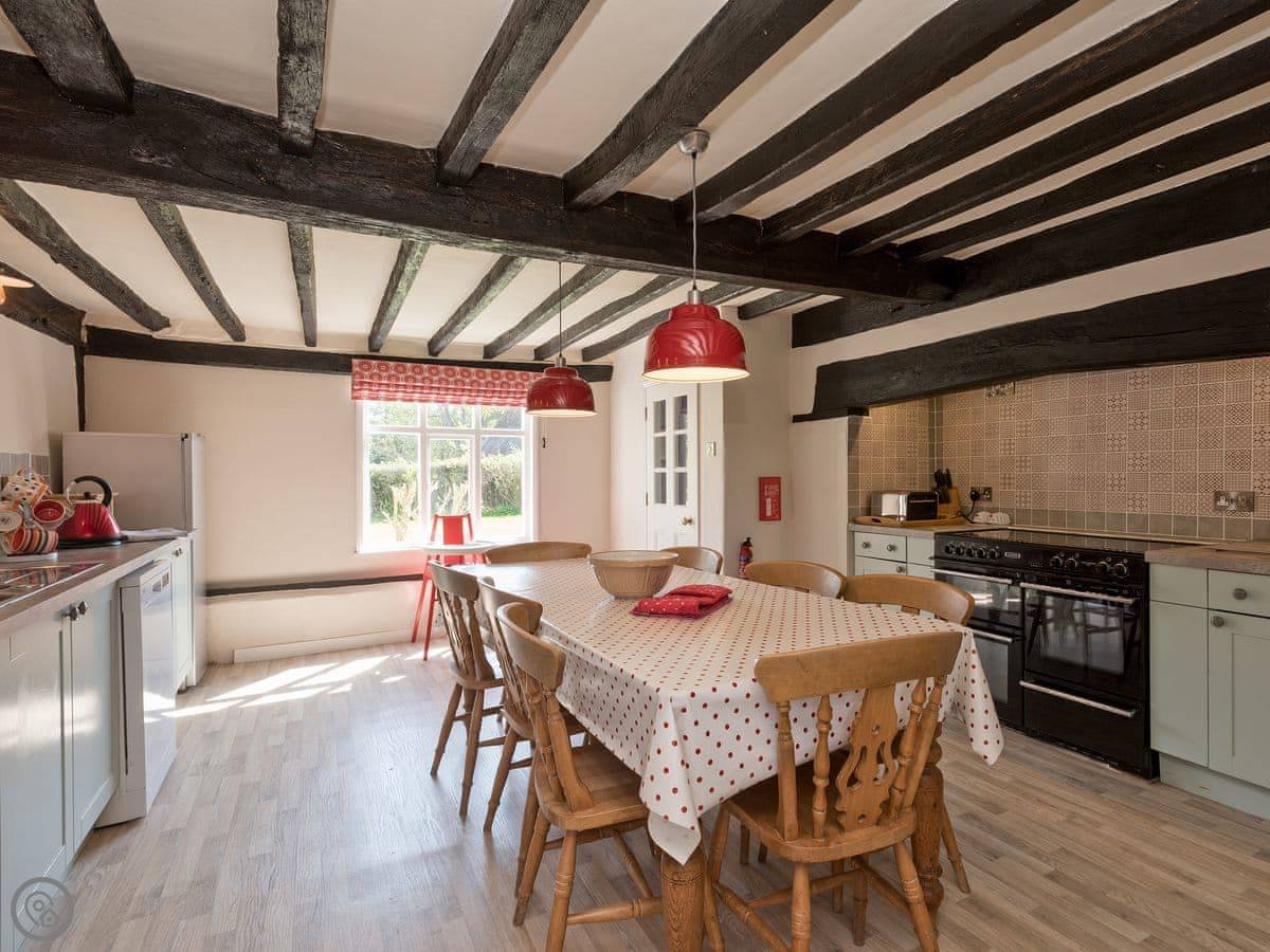 Inside, there are beams and old features, but it's been done up in a modern way. There are two sitting rooms and a big farmhouse kitchen with an electric range cooker. The dining room has a large oak table. It's spacious.