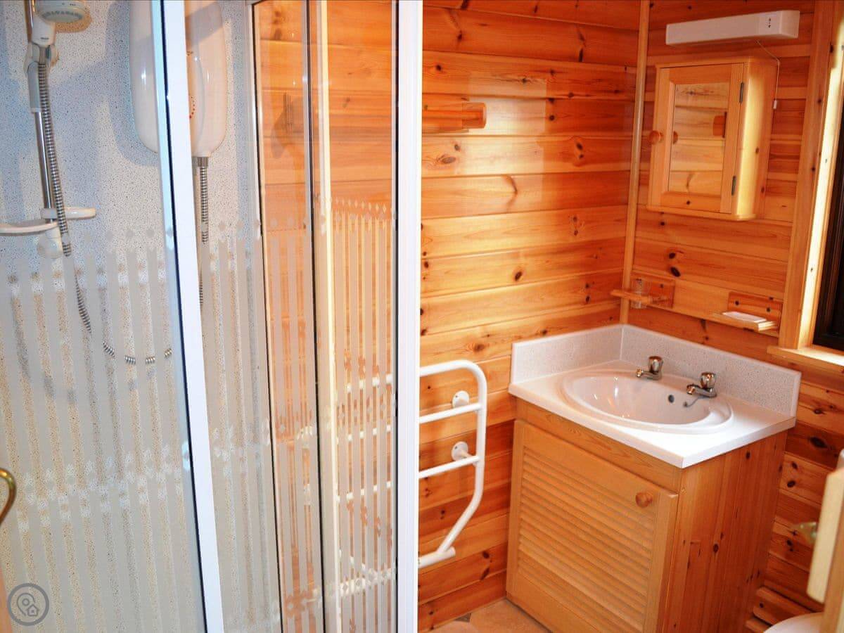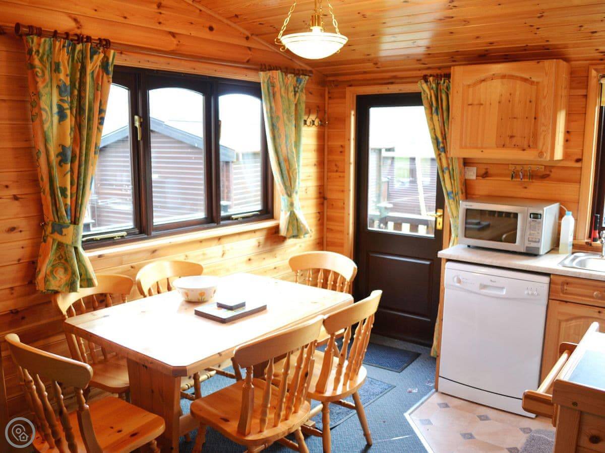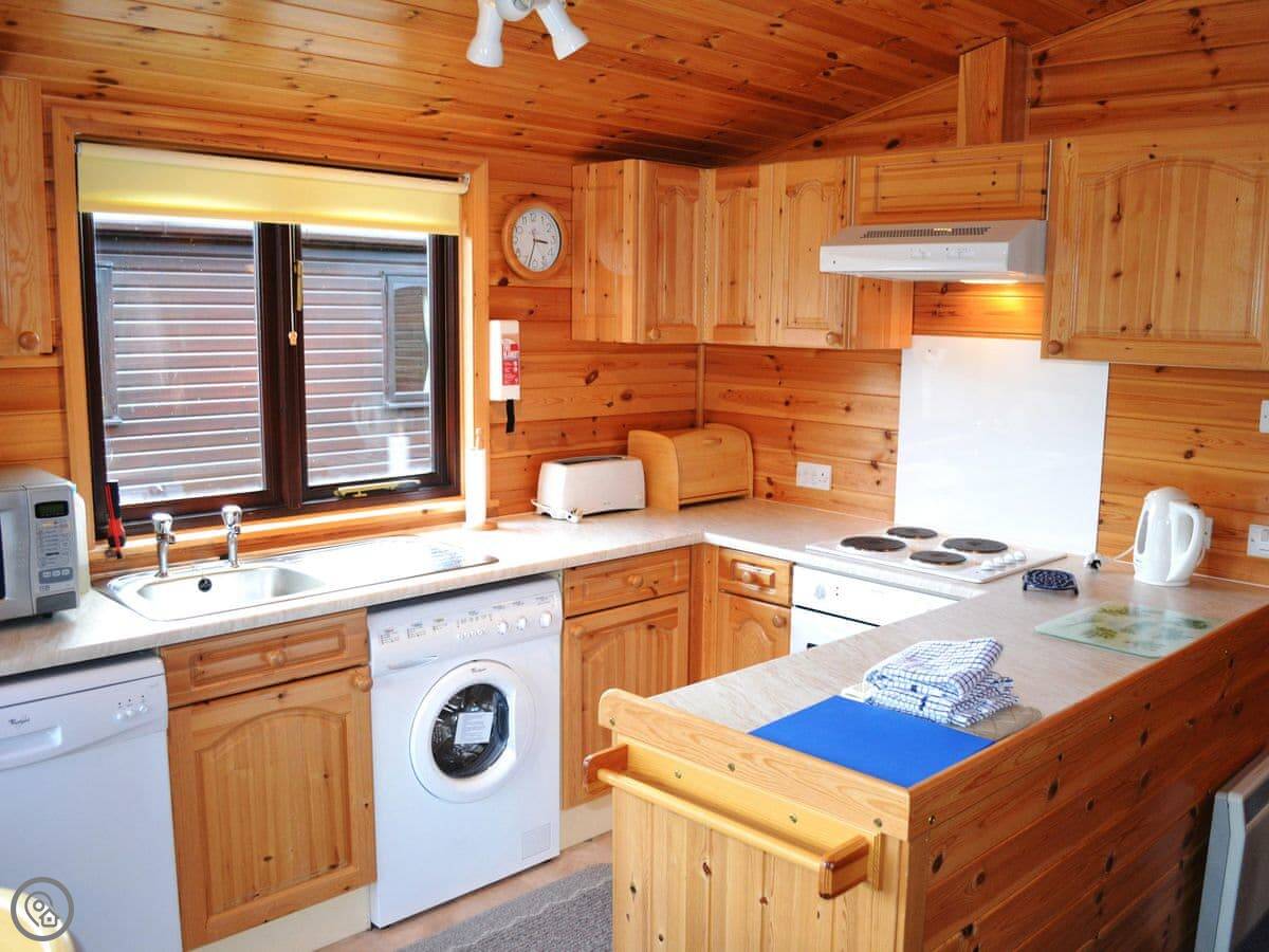 You've got a patio with garden furniture. Inside there's a washing machine, dishwasher, TV, that sort of thing. Bedding and towels are included. There's parking next to the lodge.