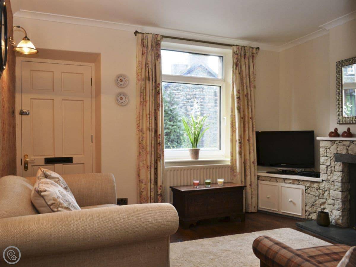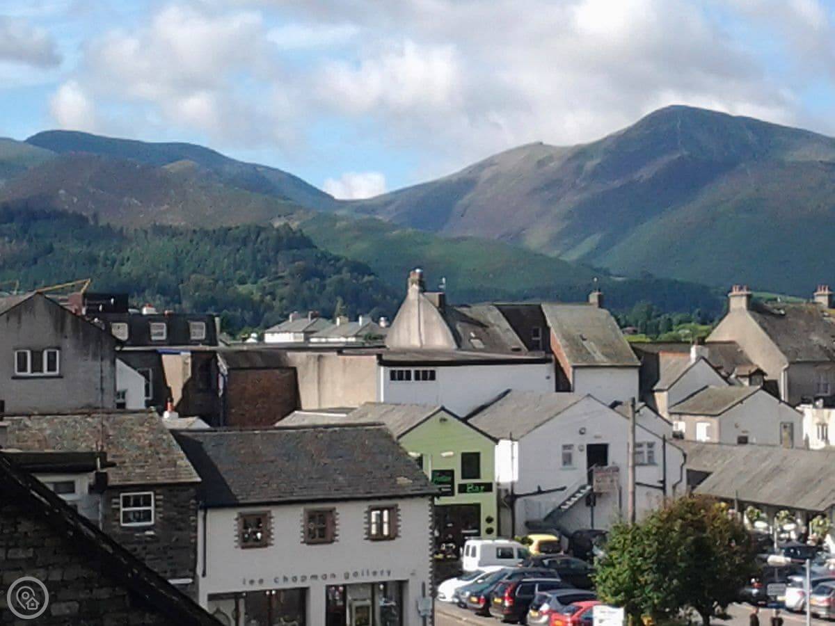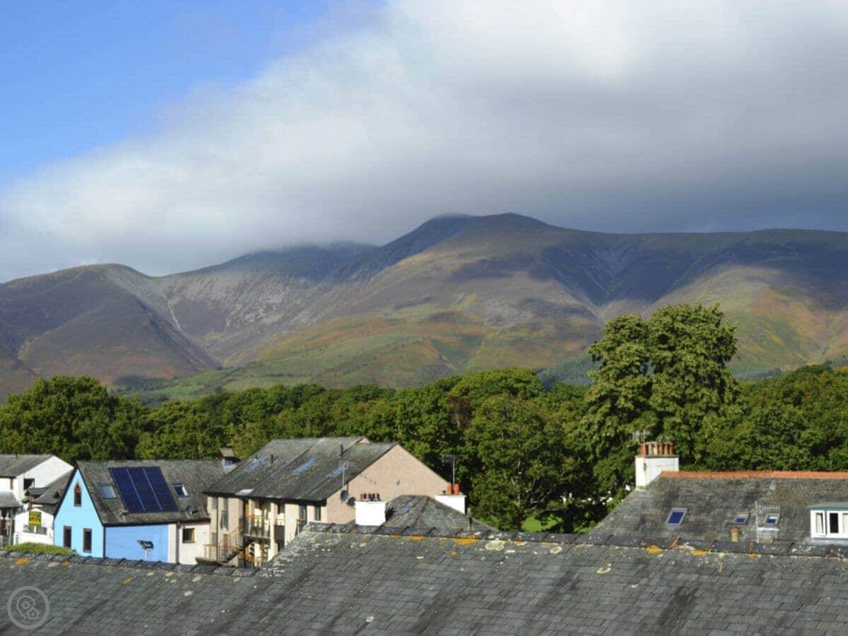 This is Catbells Cottage in Keswick. It's right in the middle of town, so you can walk to the pubs and shops. The back looks out over the fells, which is a nice view.