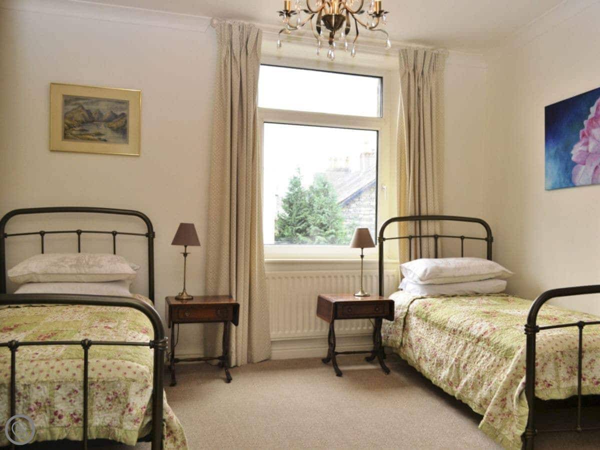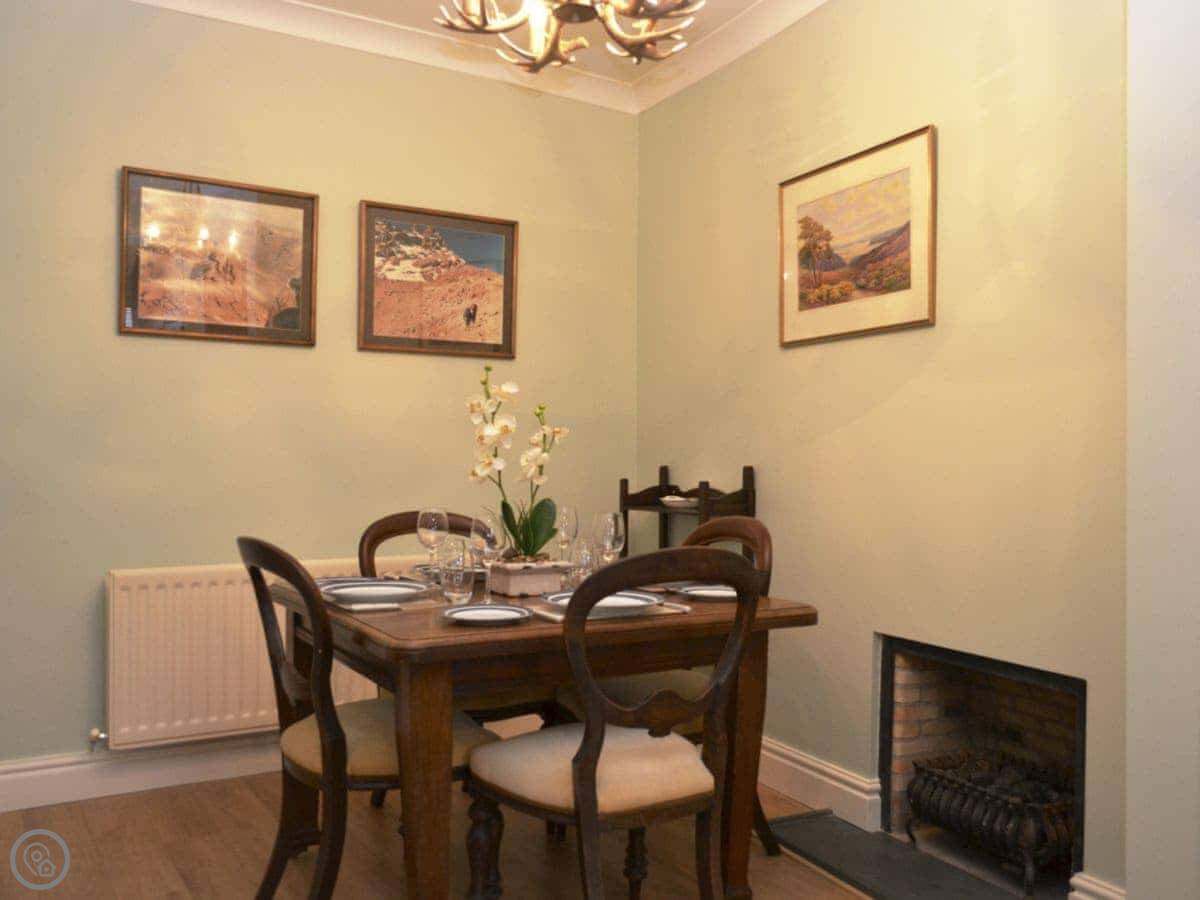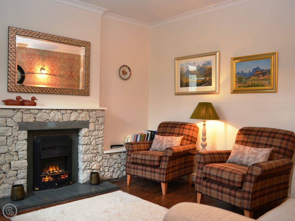 This is Catbells Cottage in Keswick. It's right in the middle of town, so you can walk to the pubs and shops. The back looks out over the fells, which is a nice view.