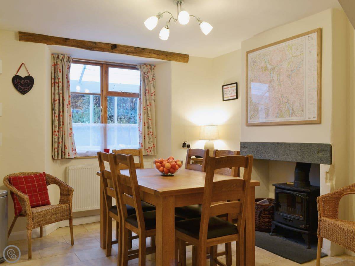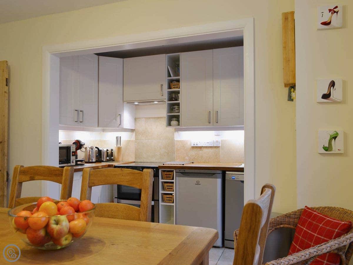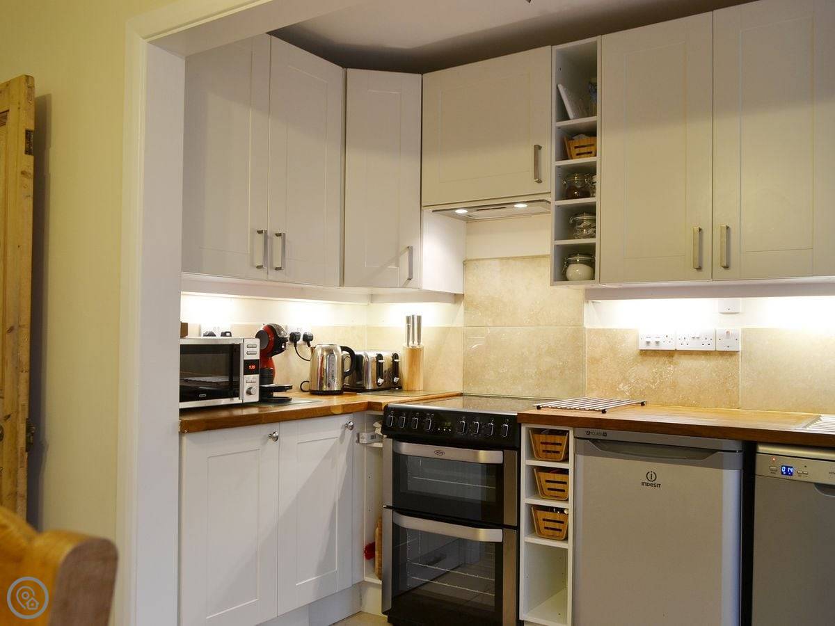 The wood burner in the lounge works well. The kitchen has what you'd need, including a dishwasher and washing machine. Bedding and towels are included. There's a cot and highchair if you need them.