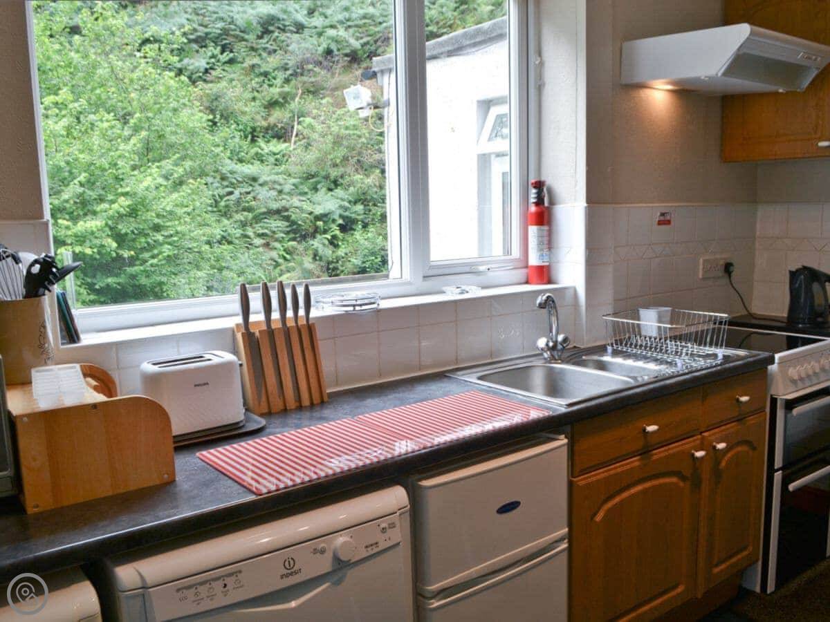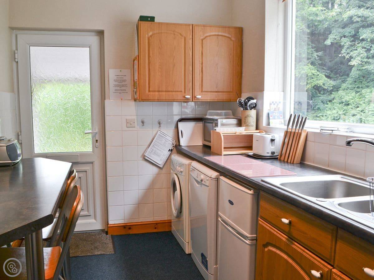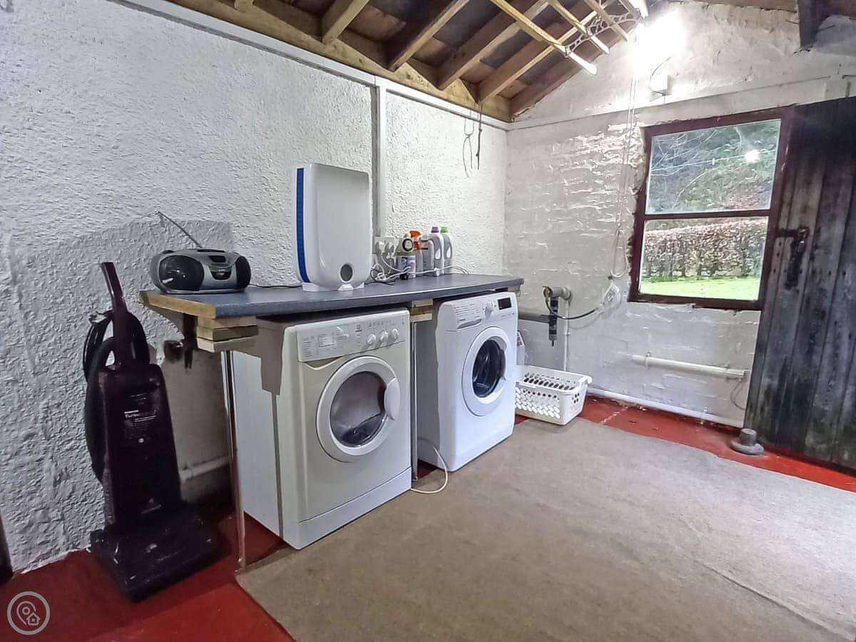 The living area is open plan with an open fire. There’s a TV. The kitchen has a breakfast bar. The old wash house outside is now a utility room with a washing machine and bike storage.