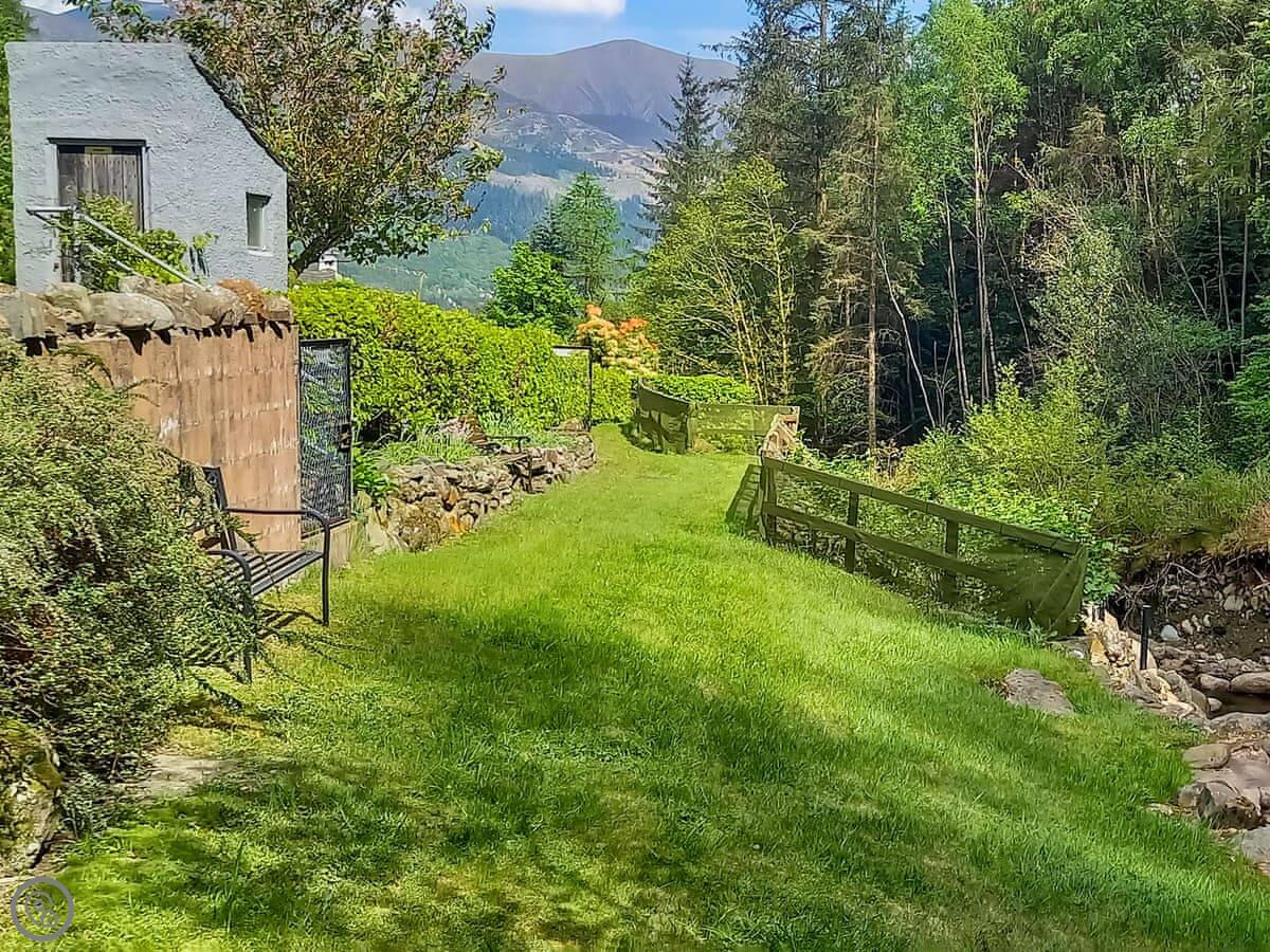 There’s a lawned garden with seating. A beck runs along the bottom of it. Parking for two cars.