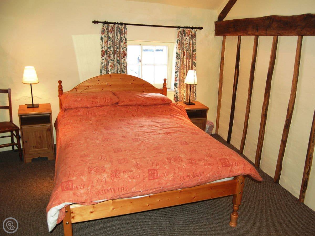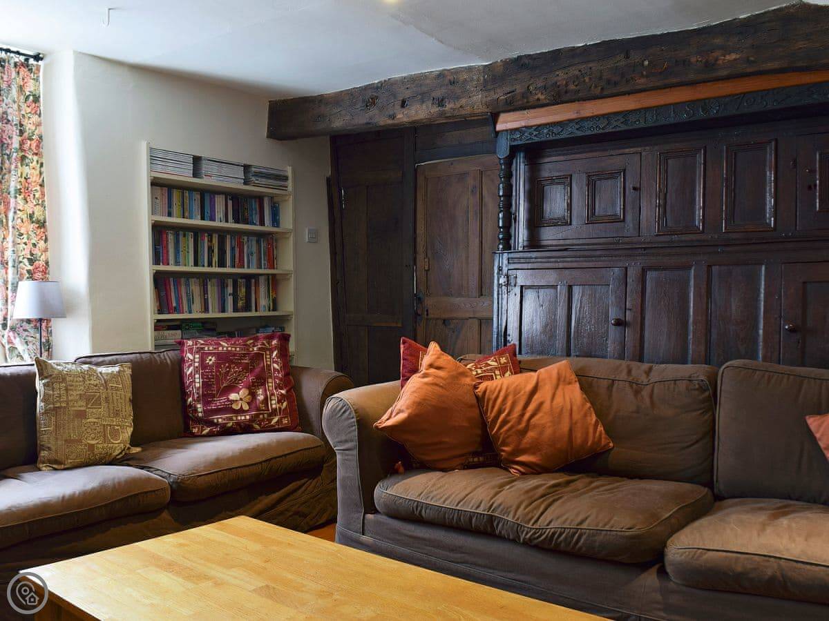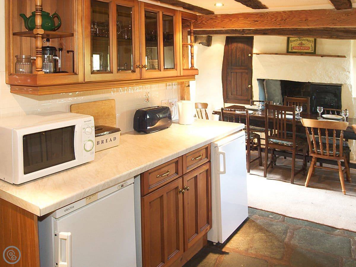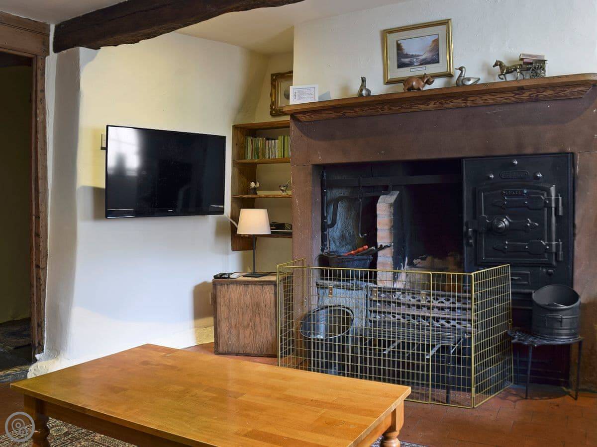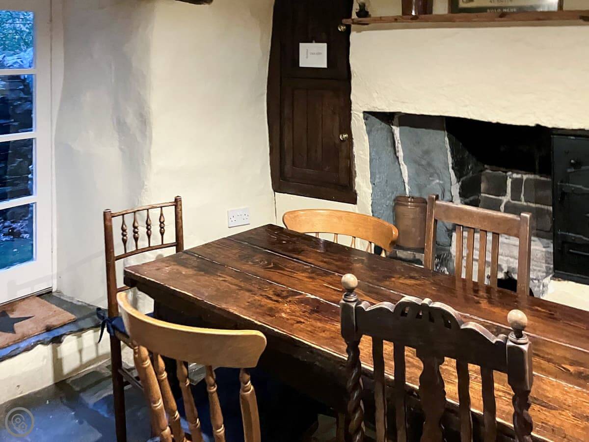 The main room has a sandstone fireplace, which is nice when the wood burner is going. There are beams in the ceilings. The floor in there is original slate flagstones. It's got character.
