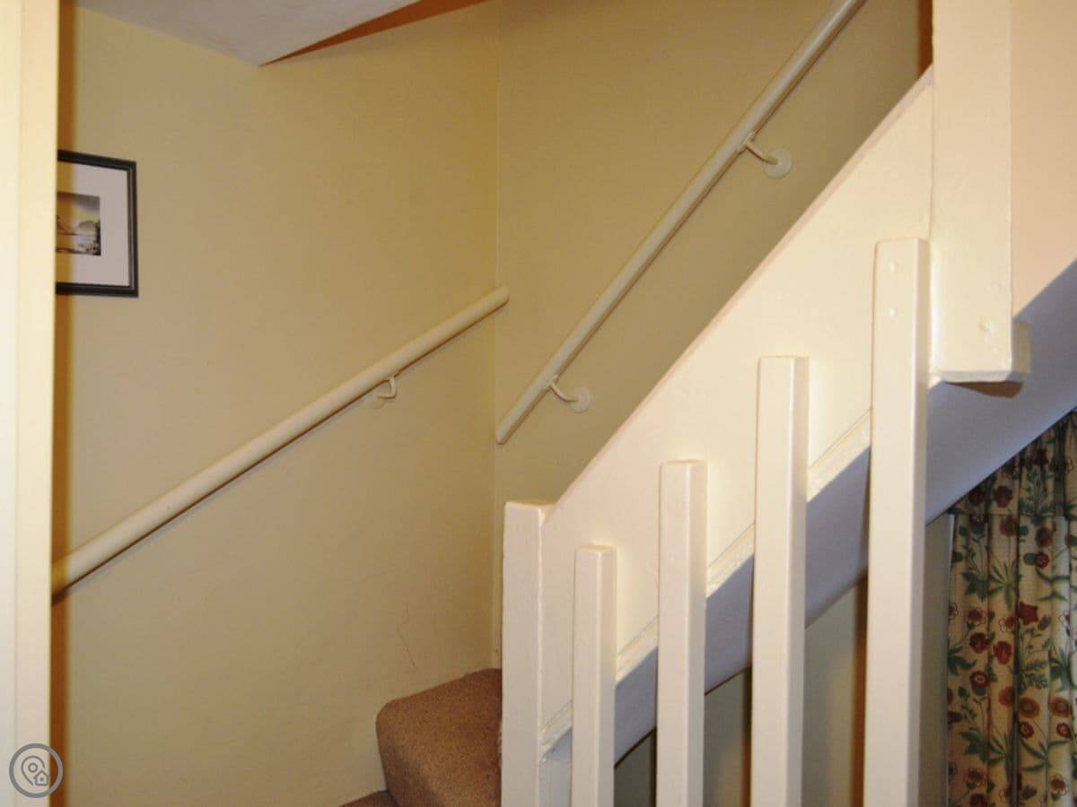 The stairs are cottage stairs. They're steep and a bit narrow. Not great if you have trouble with your knees. The upstairs rooms haven't been touched in the refurbishment, so they're a bit more traditional.