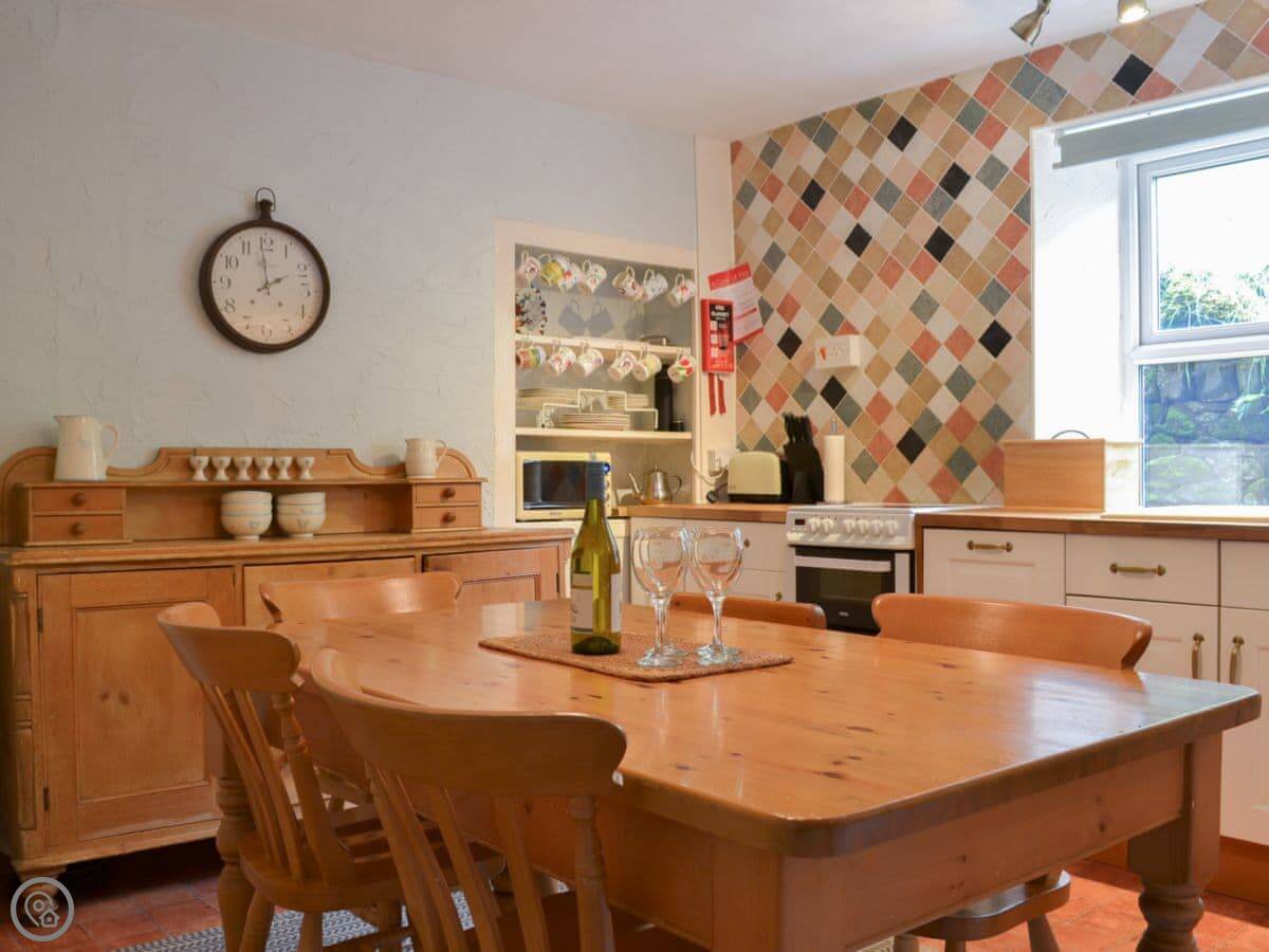It sleeps four. Two bedrooms, one bathroom. It's a 3 Star place, so it's clean and has what you need. It's not a show home. The kitchen's fine. There's a wood burner in the living room.