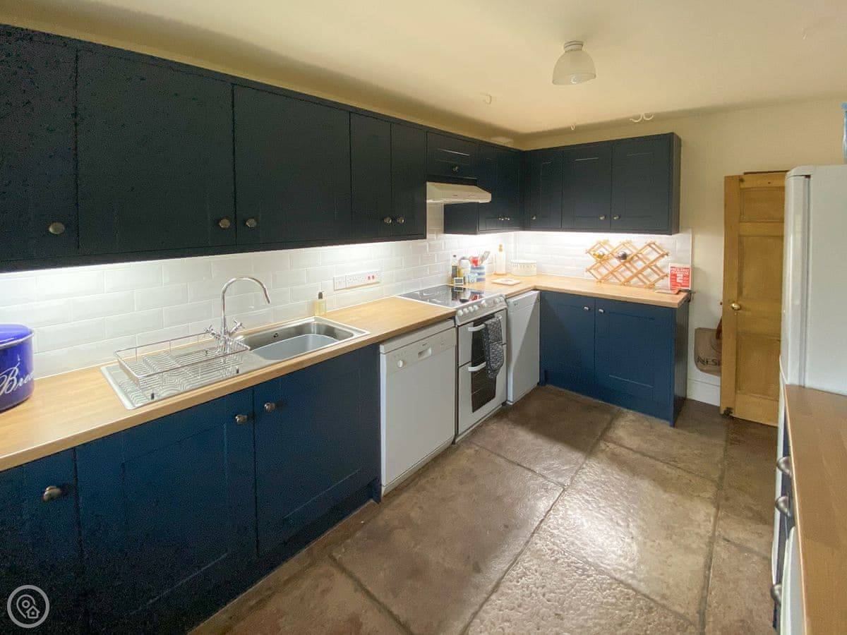 In terms of what's here: there's parking for a couple of cars. The garden has a patio and a BBQ. Inside there's a washing machine, dishwasher, WiFi, and a TV. Bedding is included. We can provide a cot and a highchair. We can't take pets, sorry.