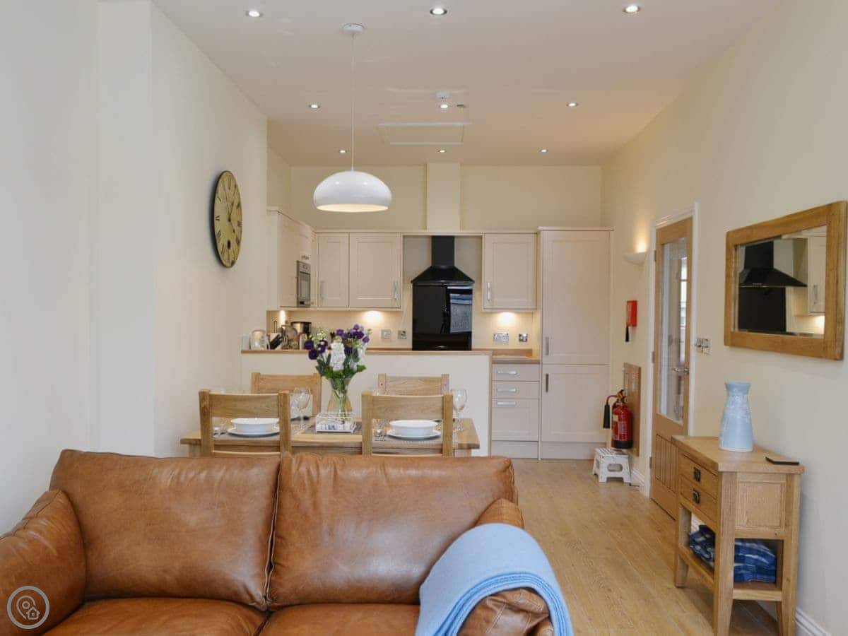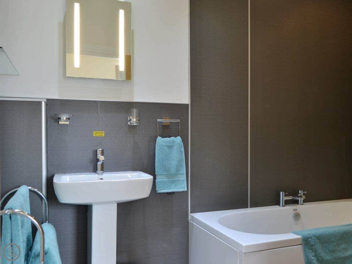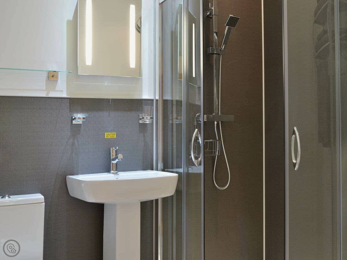 It sleeps four. Two bedrooms, both with their own bathroom. One's got a shower, the other has a bath with a shower over it. It's got a 4 Star rating. It's modern inside, everything's in good condition.