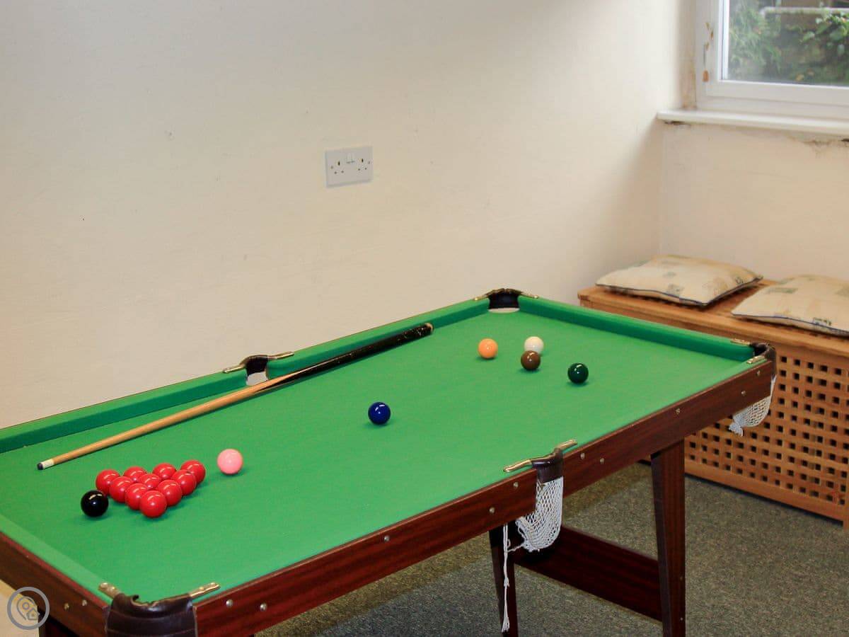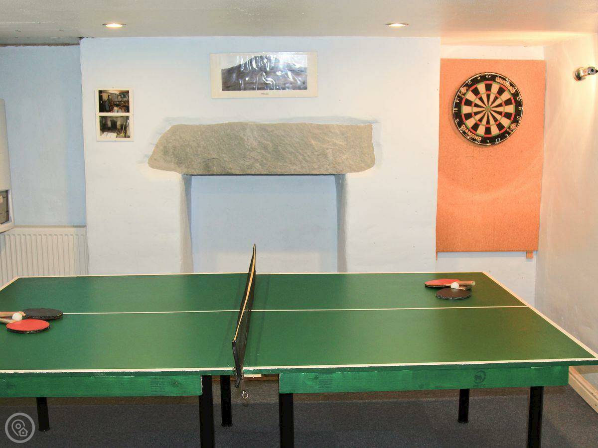 There's a small enclosed garden at the front. At the back, there's private parking for two cars, which is useful in Ambleside. Down in the basement there are two rooms with a table tennis table, darts, and a small snooker table. It's a good space if the weather turns.