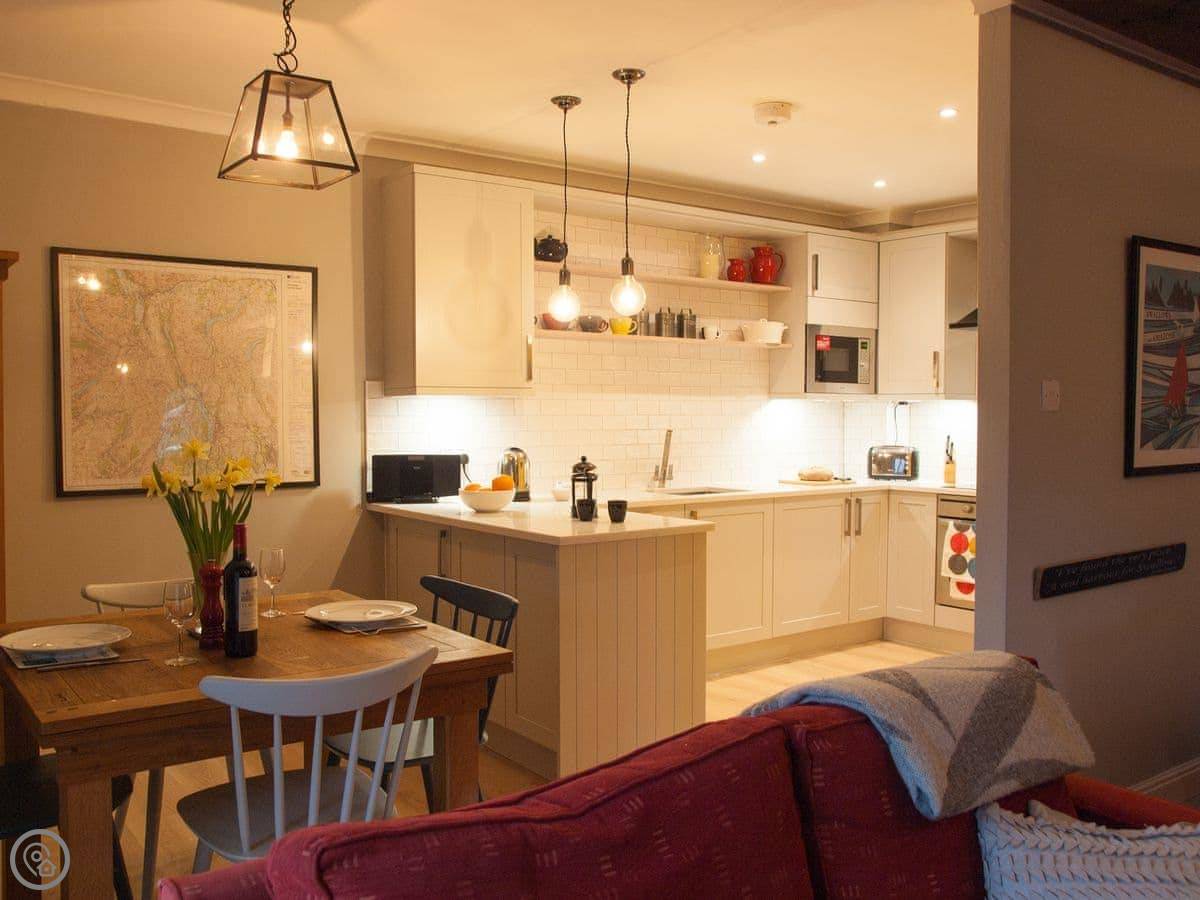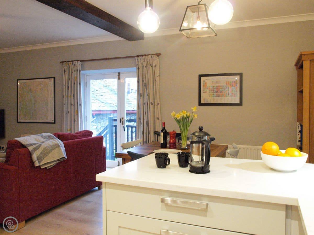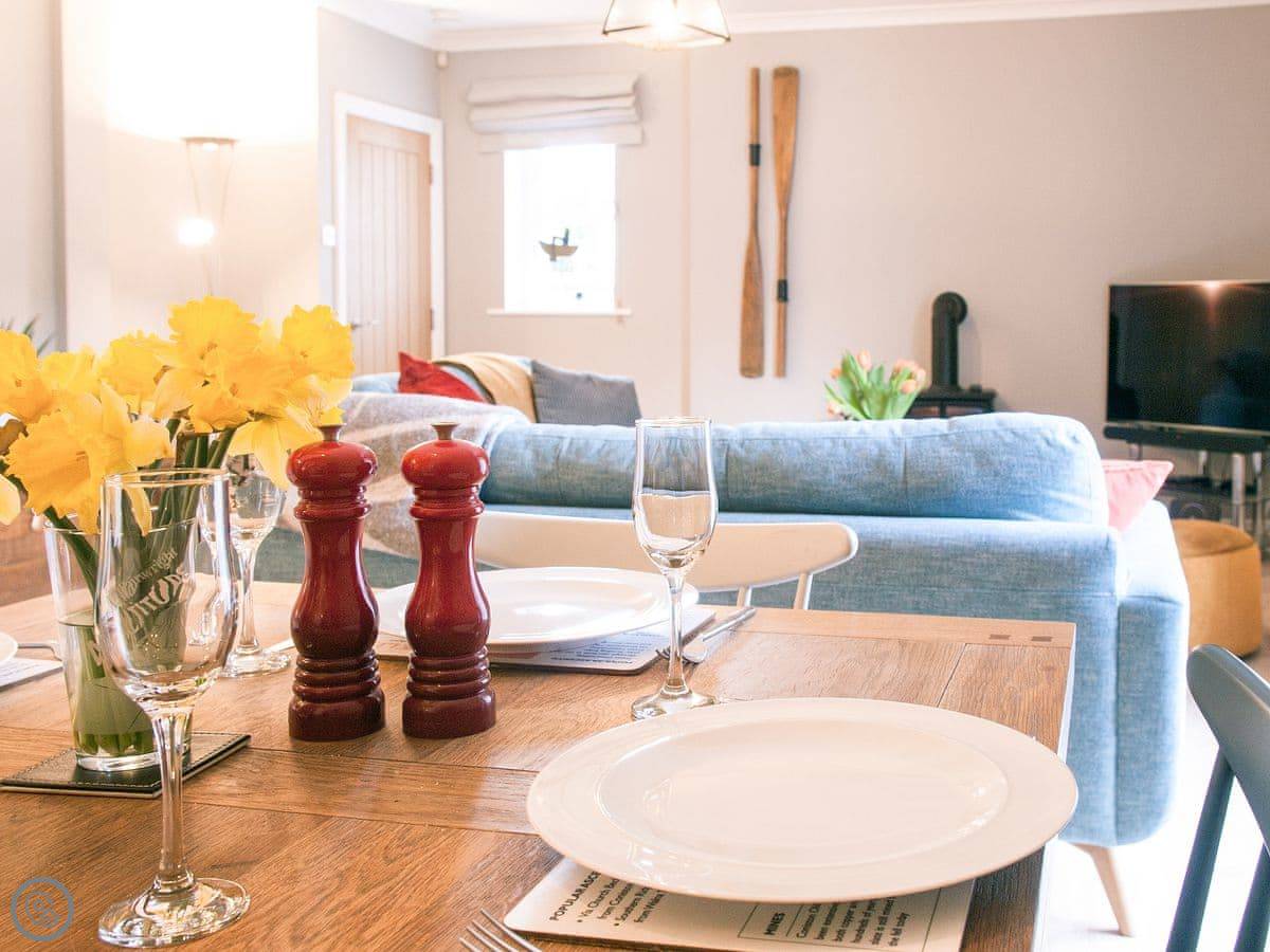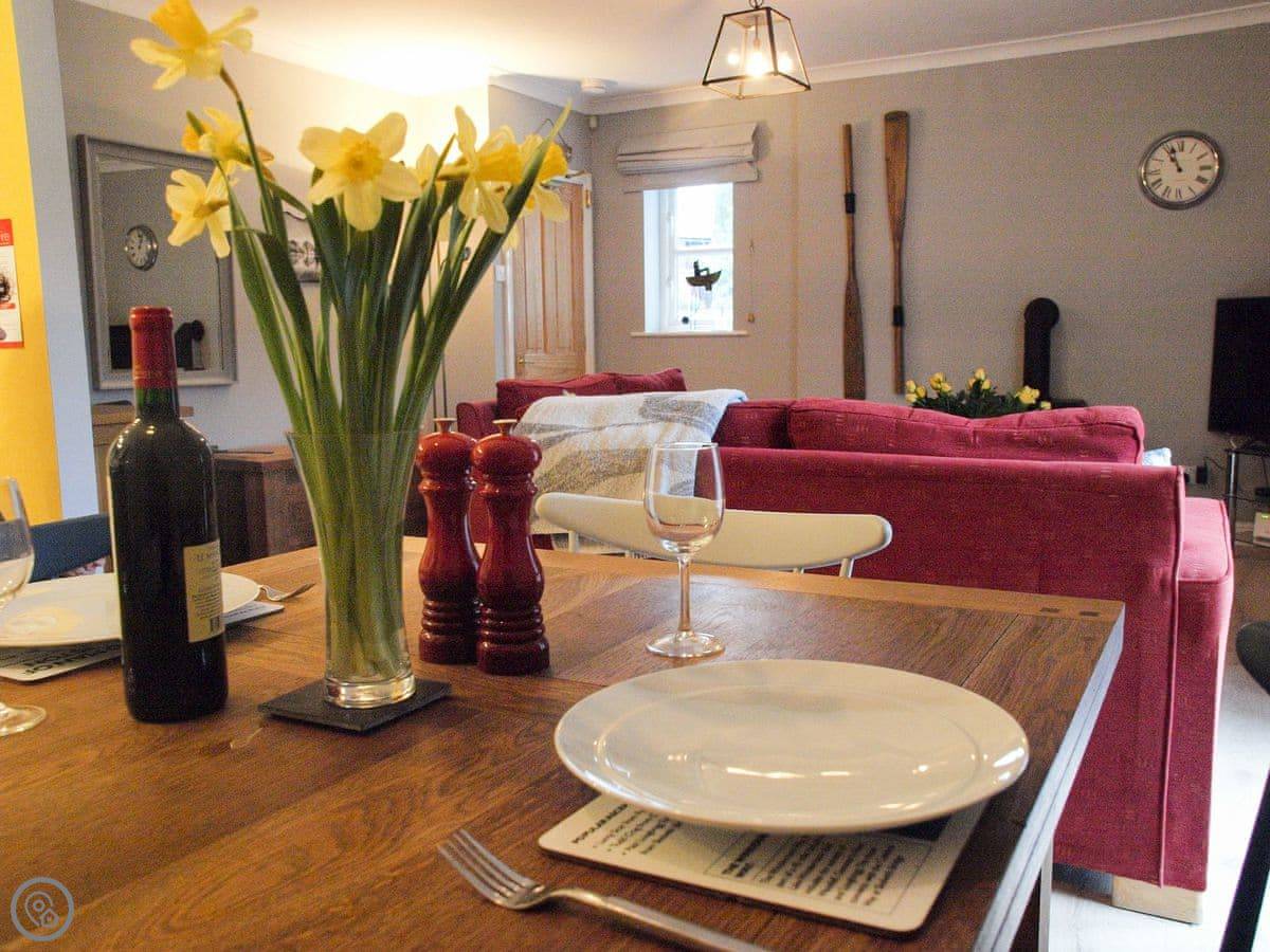 The living area is open plan, so the kitchen, dining table and sofas are all in one room. It's a good space if you're all together.