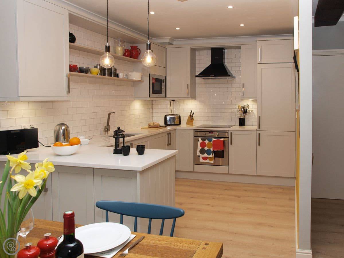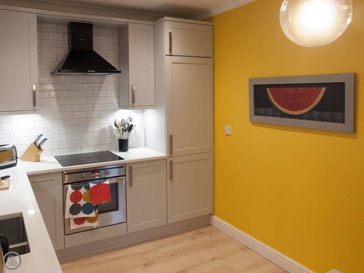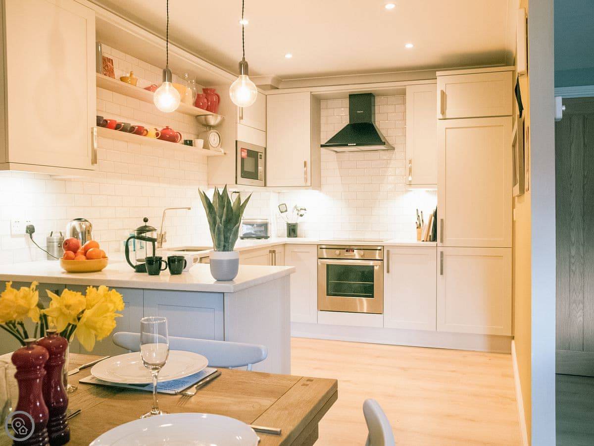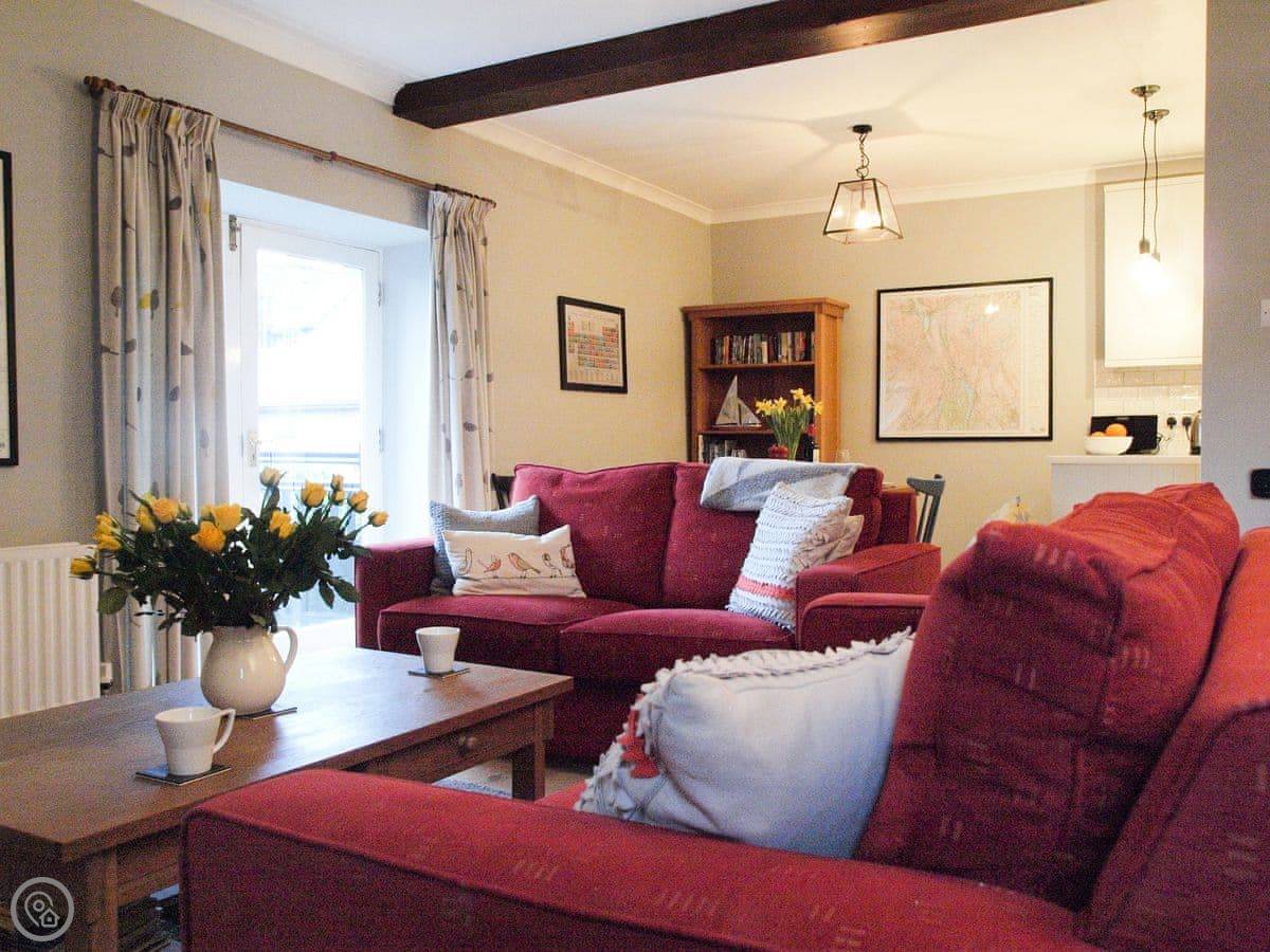 The living area is open plan, so the kitchen, dining table and sofas are all in one room. It's a good space if you're all together.