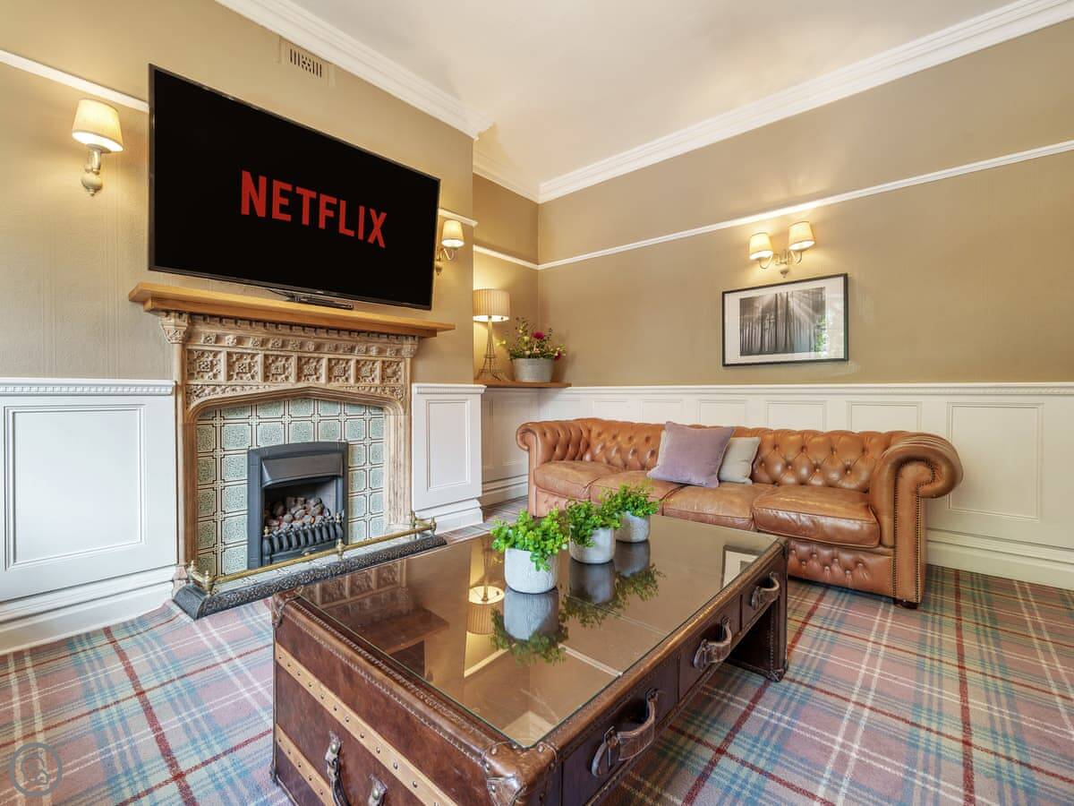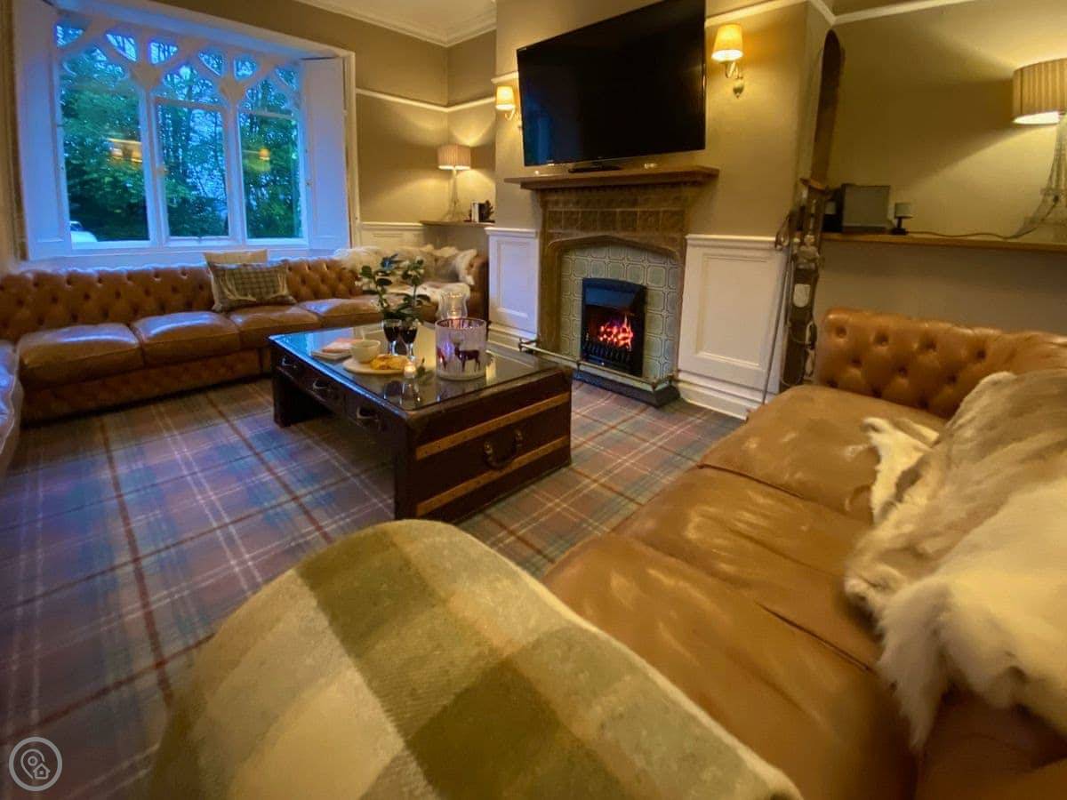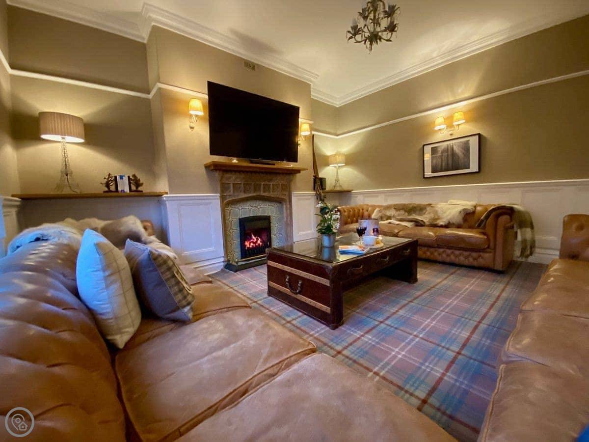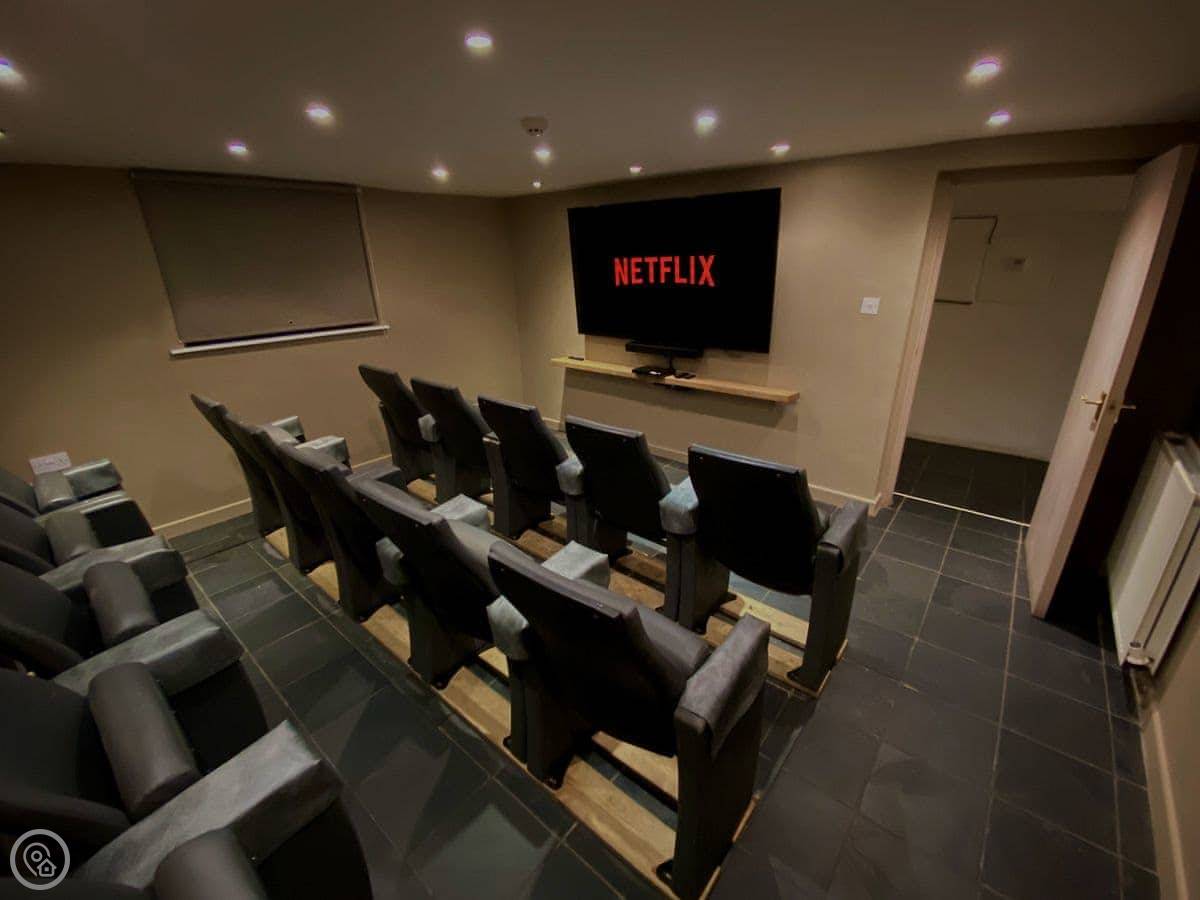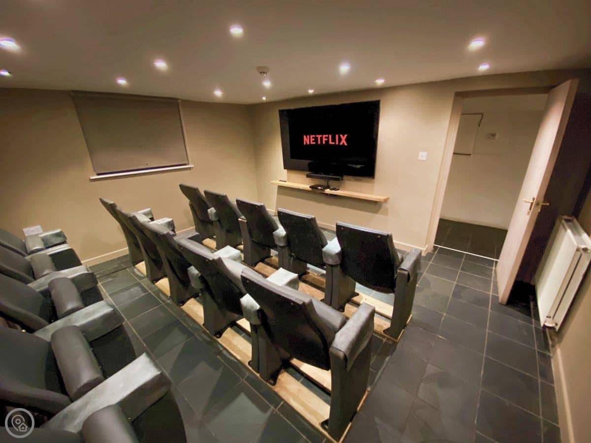 There's a lounge with a gas fire and leather sofas. The fireplace is a listed feature, a copy of one in Westminster. Down in the cellar, there's a proper cinema room with fourteen seats. It's quite dark down there, which is right for a cinema.
