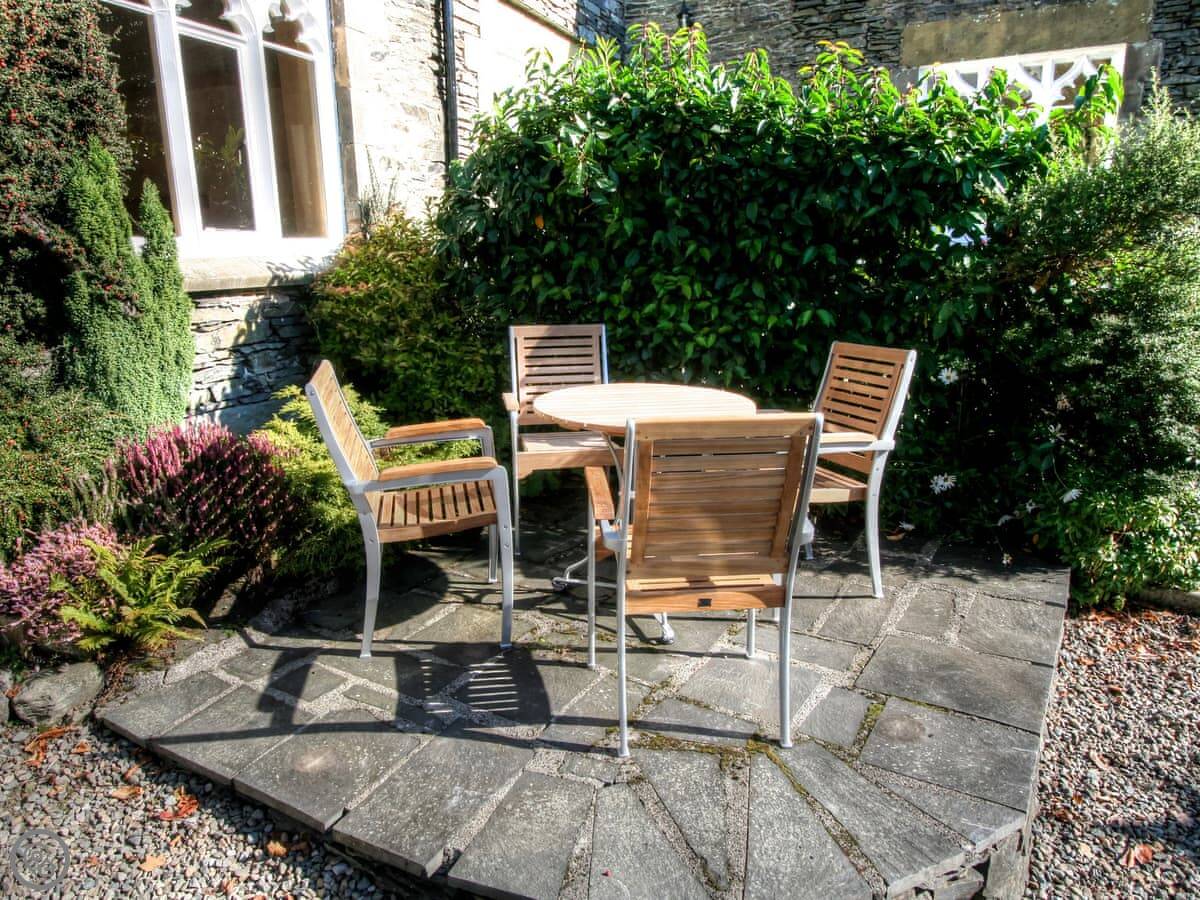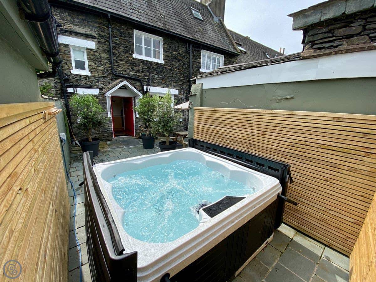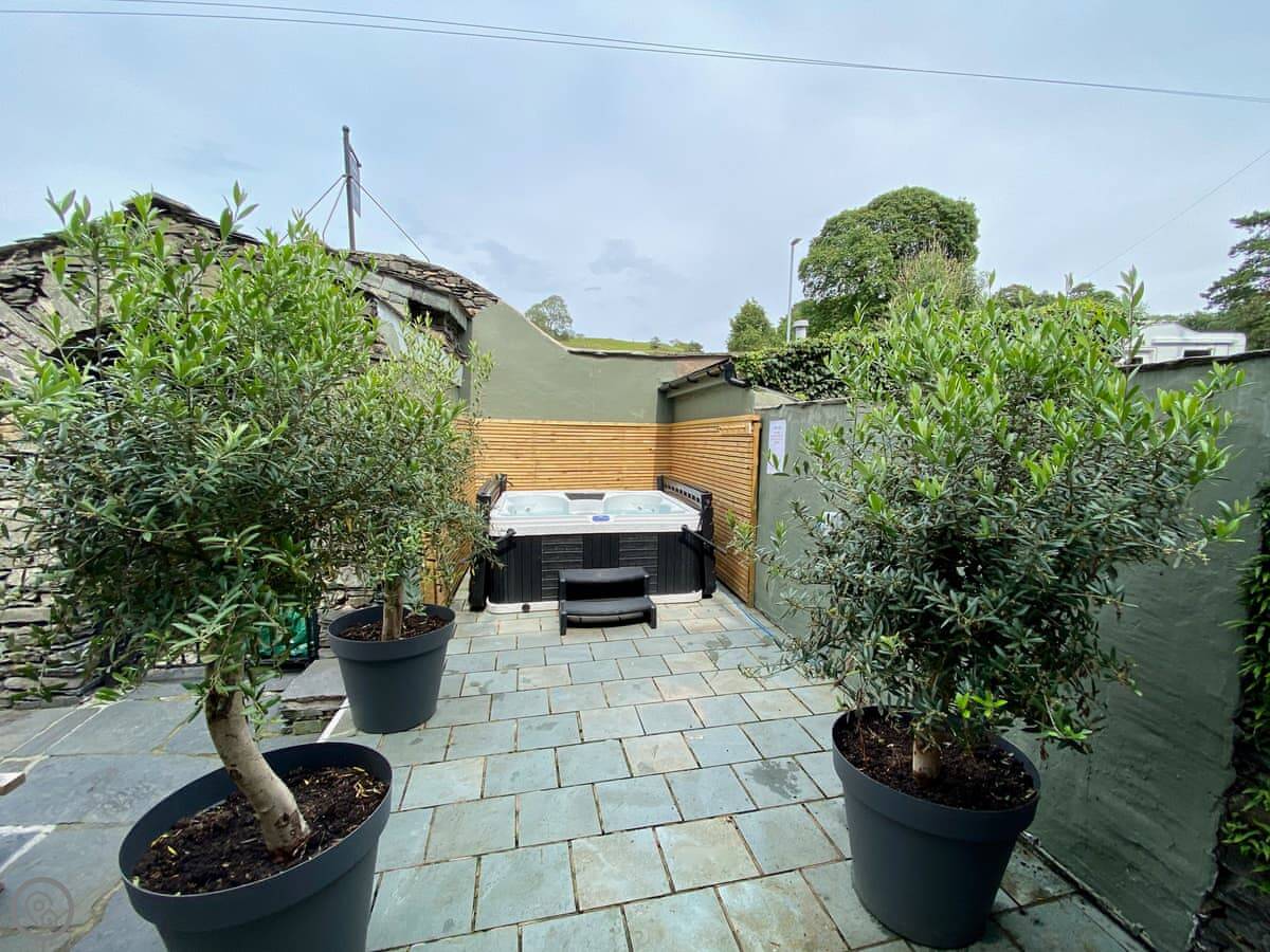 Outside at the back there's a walled courtyard. It's private. There's a large teak table and chairs on a slate patio, and a seven-person hot tub. At the front, there's a smaller patio that gets the sun in the morning, good for a coffee.