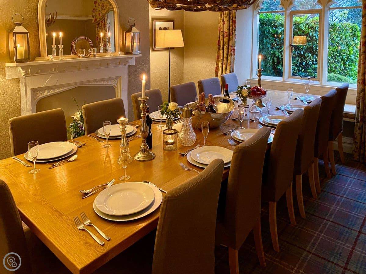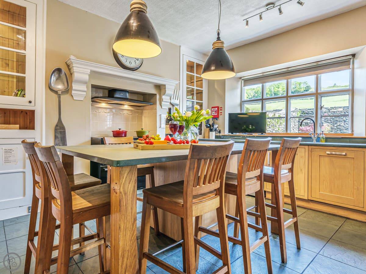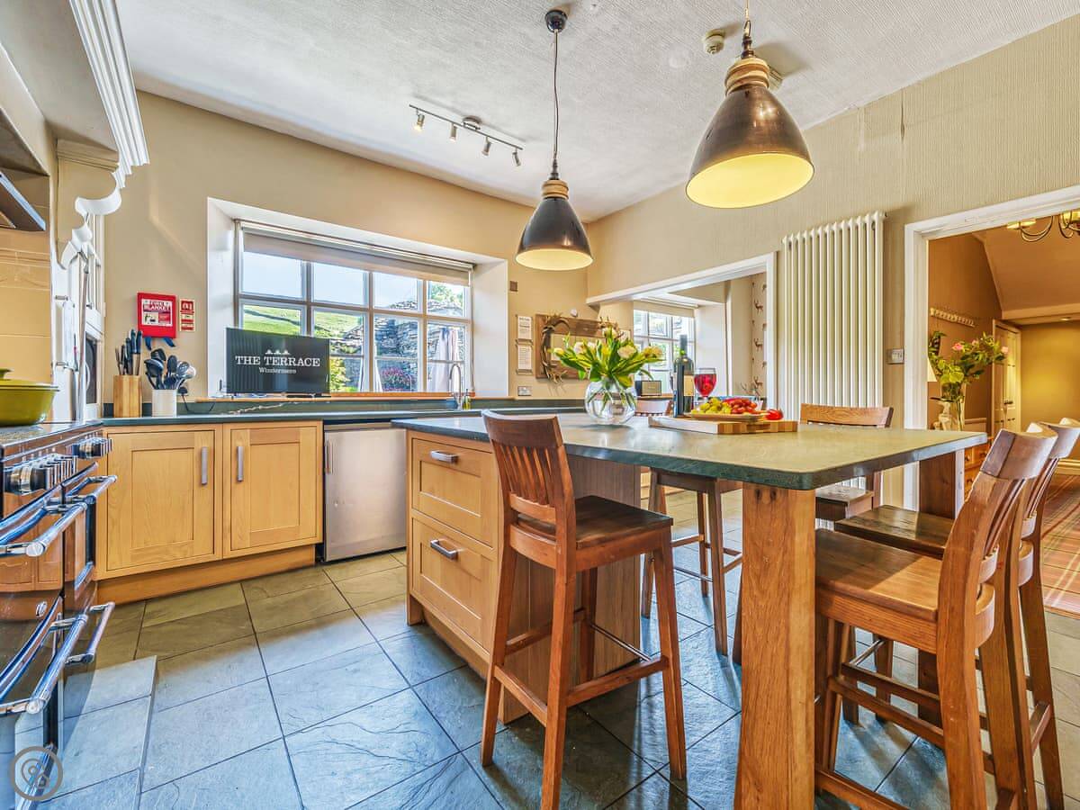 The kitchen is big and has a large range cooker, a big table in the middle, and a wine cooler. The dining room table is huge, you can all sit round it.