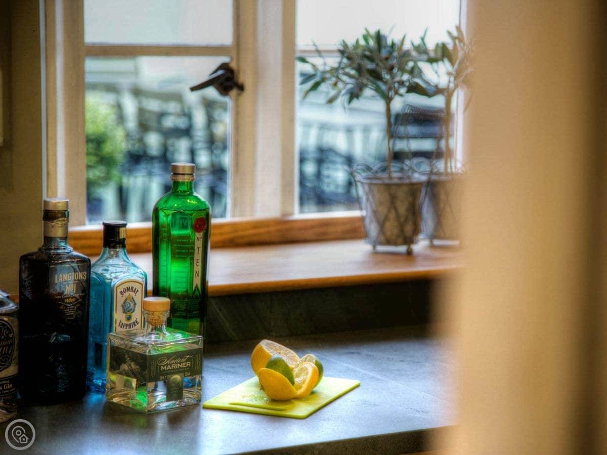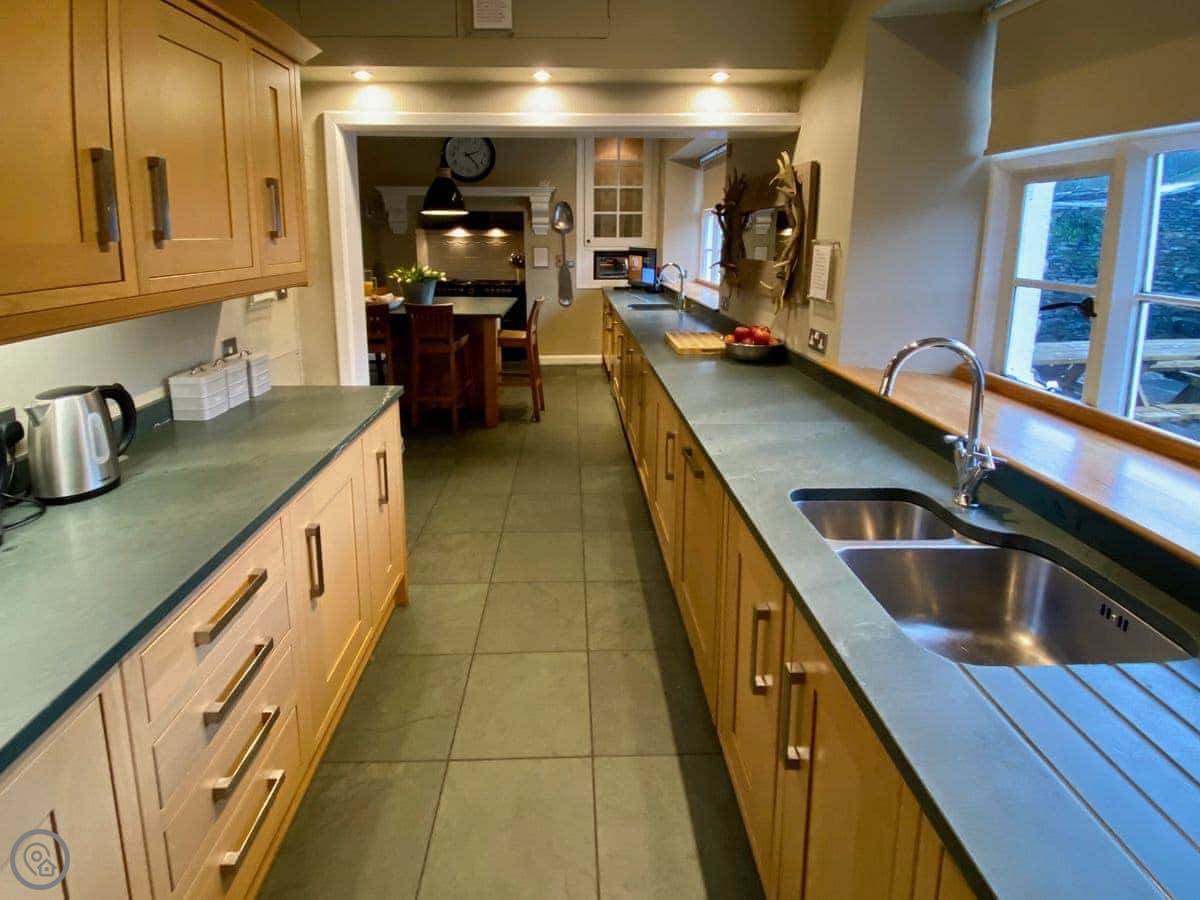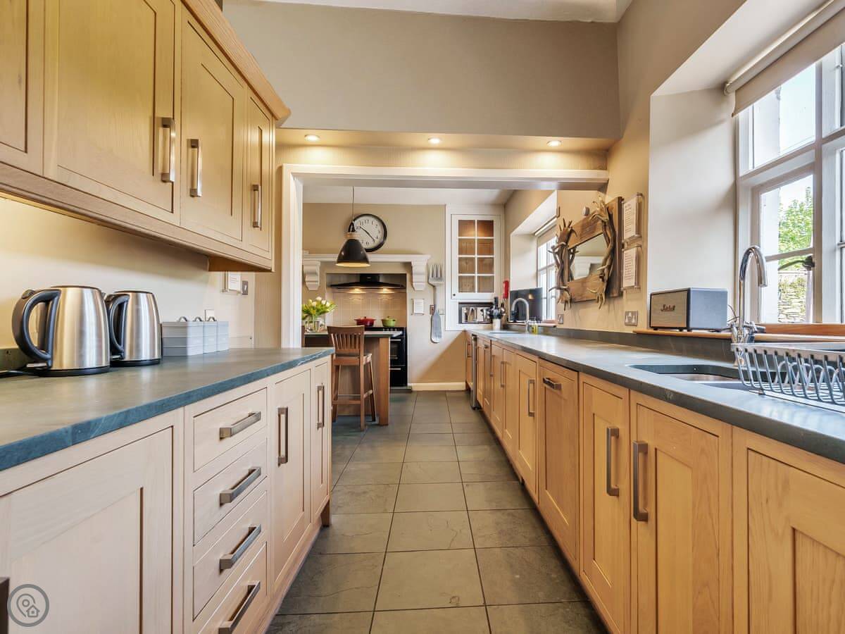 The kitchen is big and has a large range cooker, a big table in the middle, and a wine cooler. The dining room table is huge, you can all sit round it.