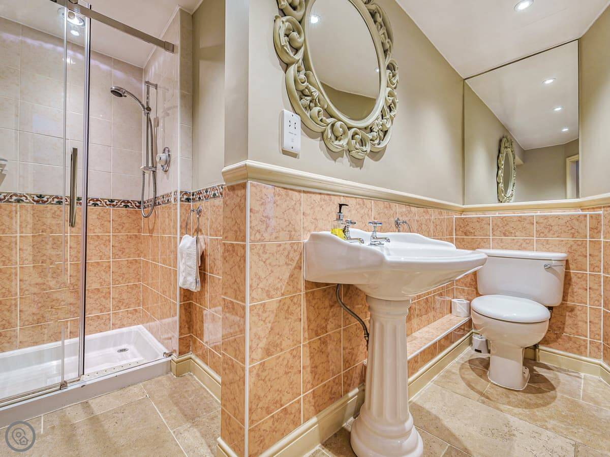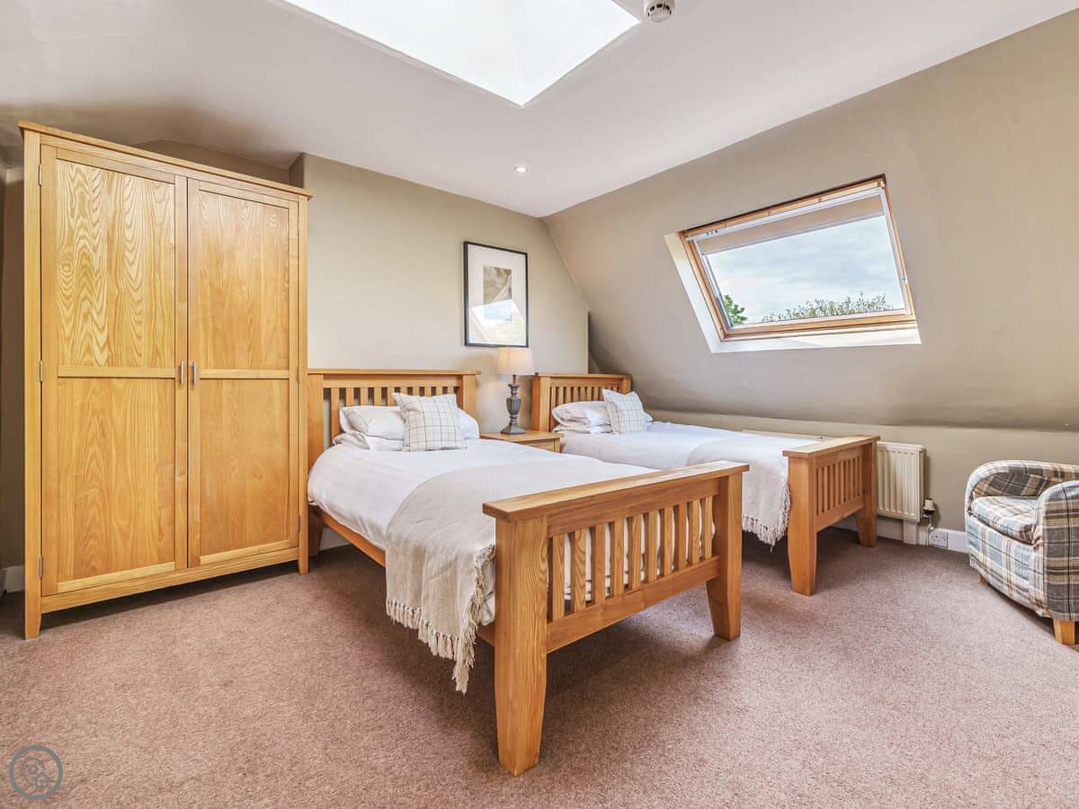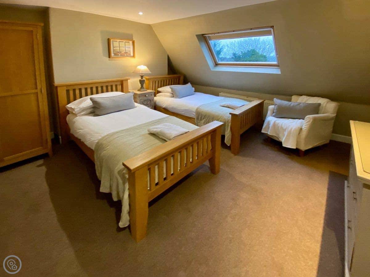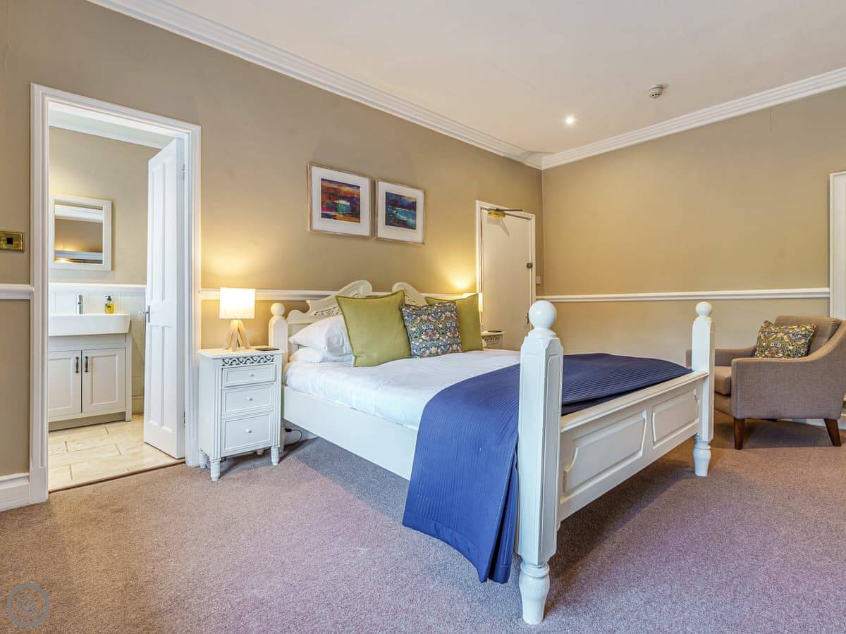 Each bedroom has its own bathroom or ensuite, which is really useful with that many people. There are two four-poster beds. The stairs are normal.