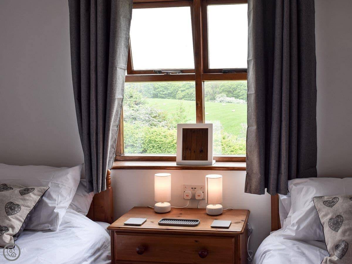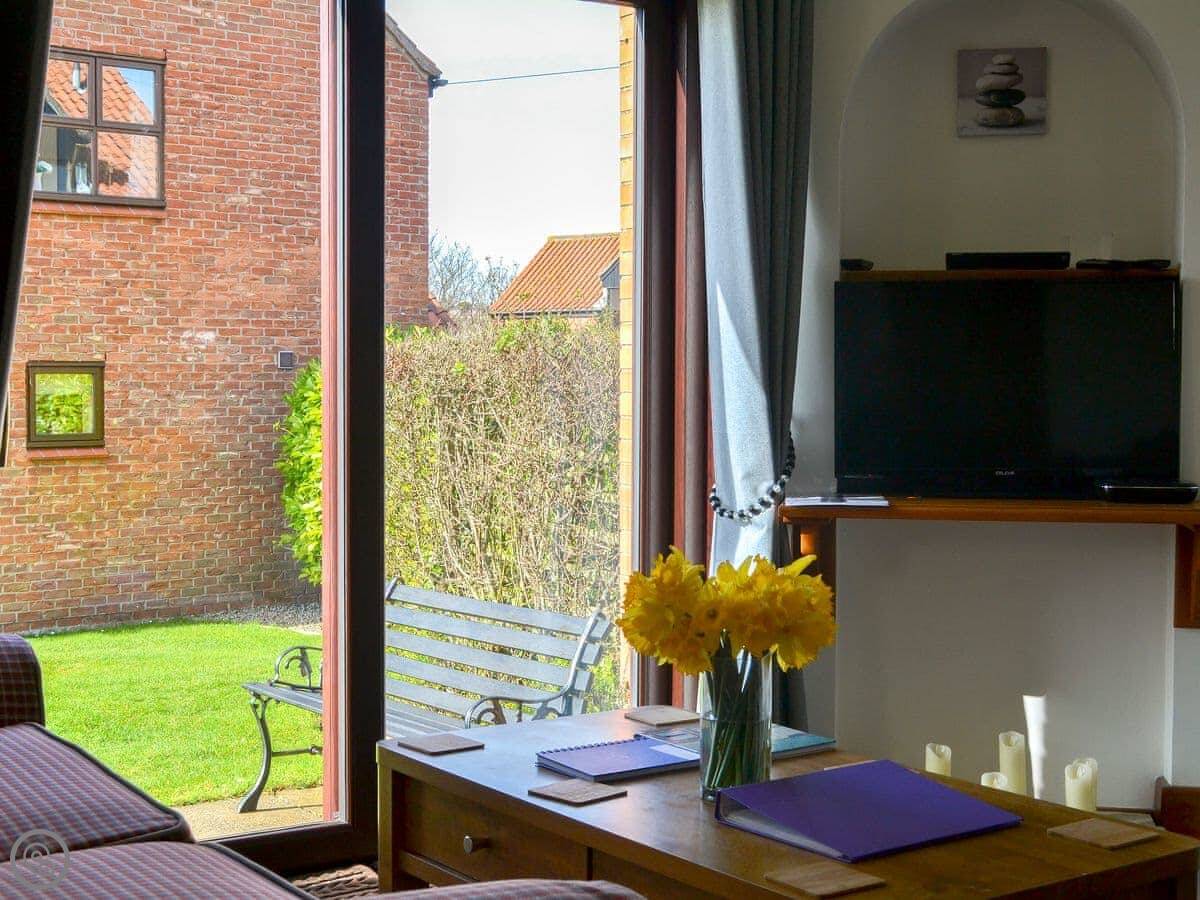 The living area has sliding doors to a patio with a picnic bench. Good for a morning coffee. The North York Moors Railway line runs past at the bottom of the valley. You can see and hear the steam trains go by sometimes.