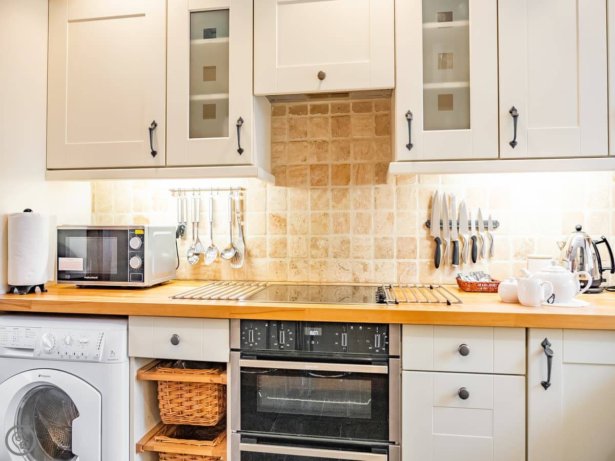 For facilities, it's got what you'd expect: WiFi, TV, washing machine, dishwasher. We provide the bedding and towels. There's a cot and a highchair if you need them.
