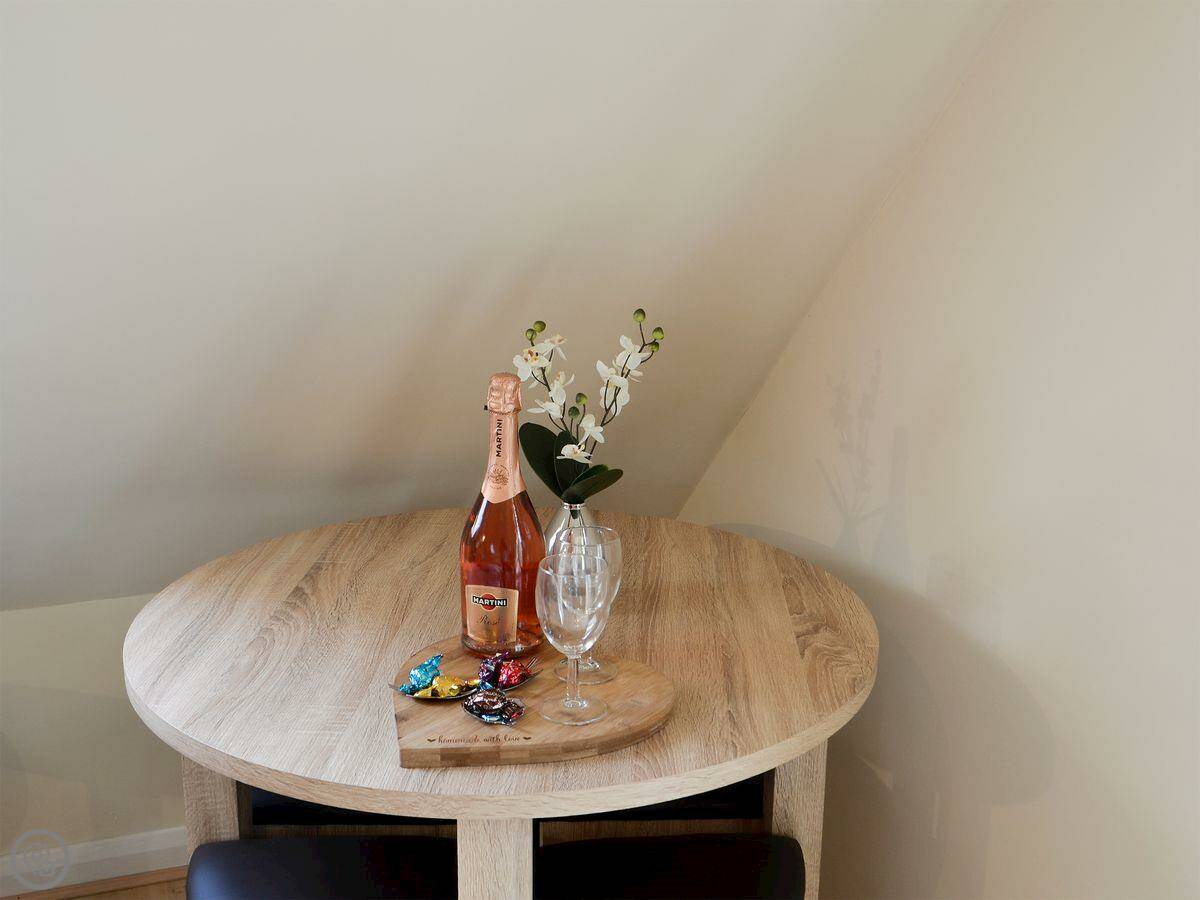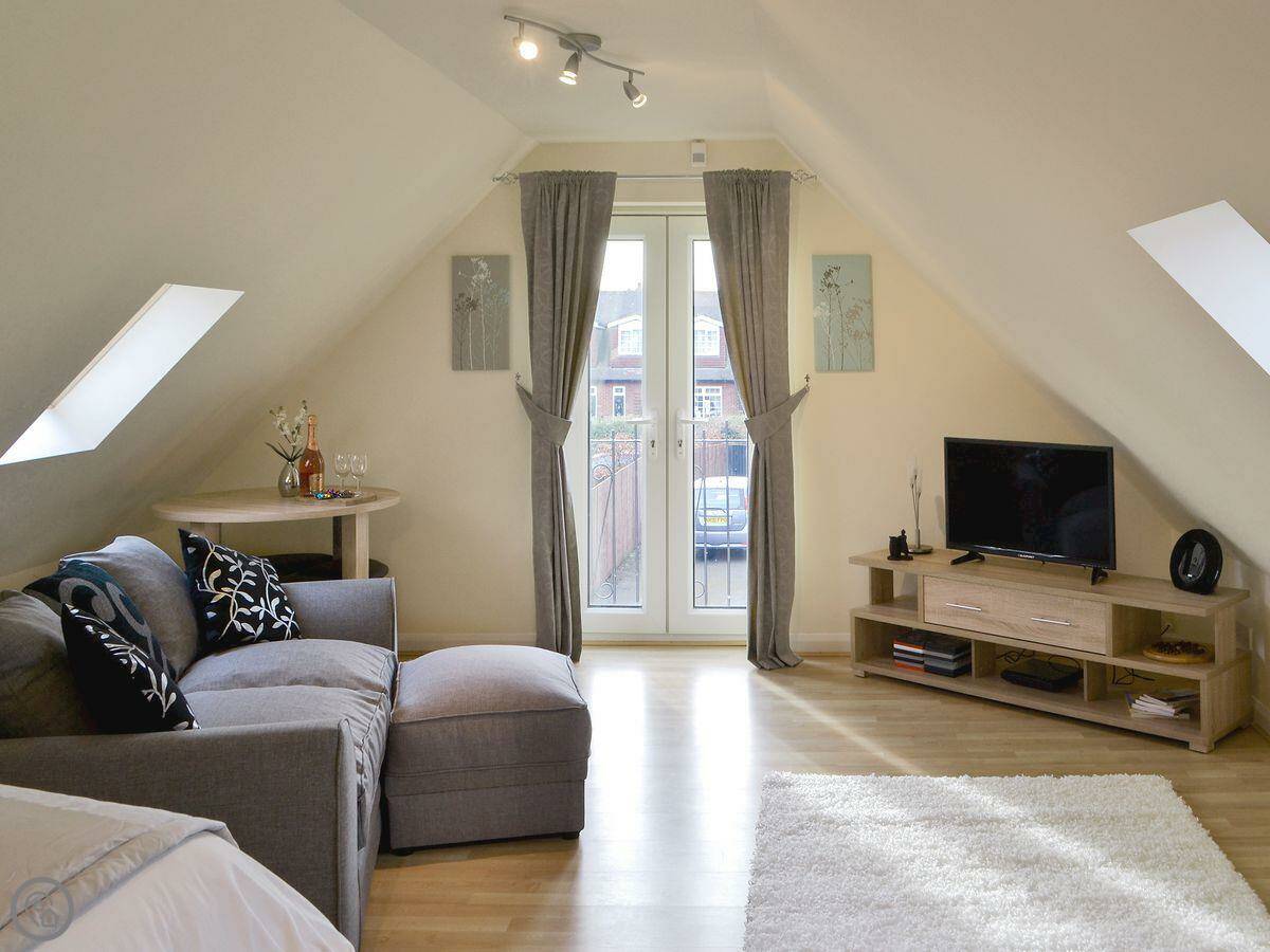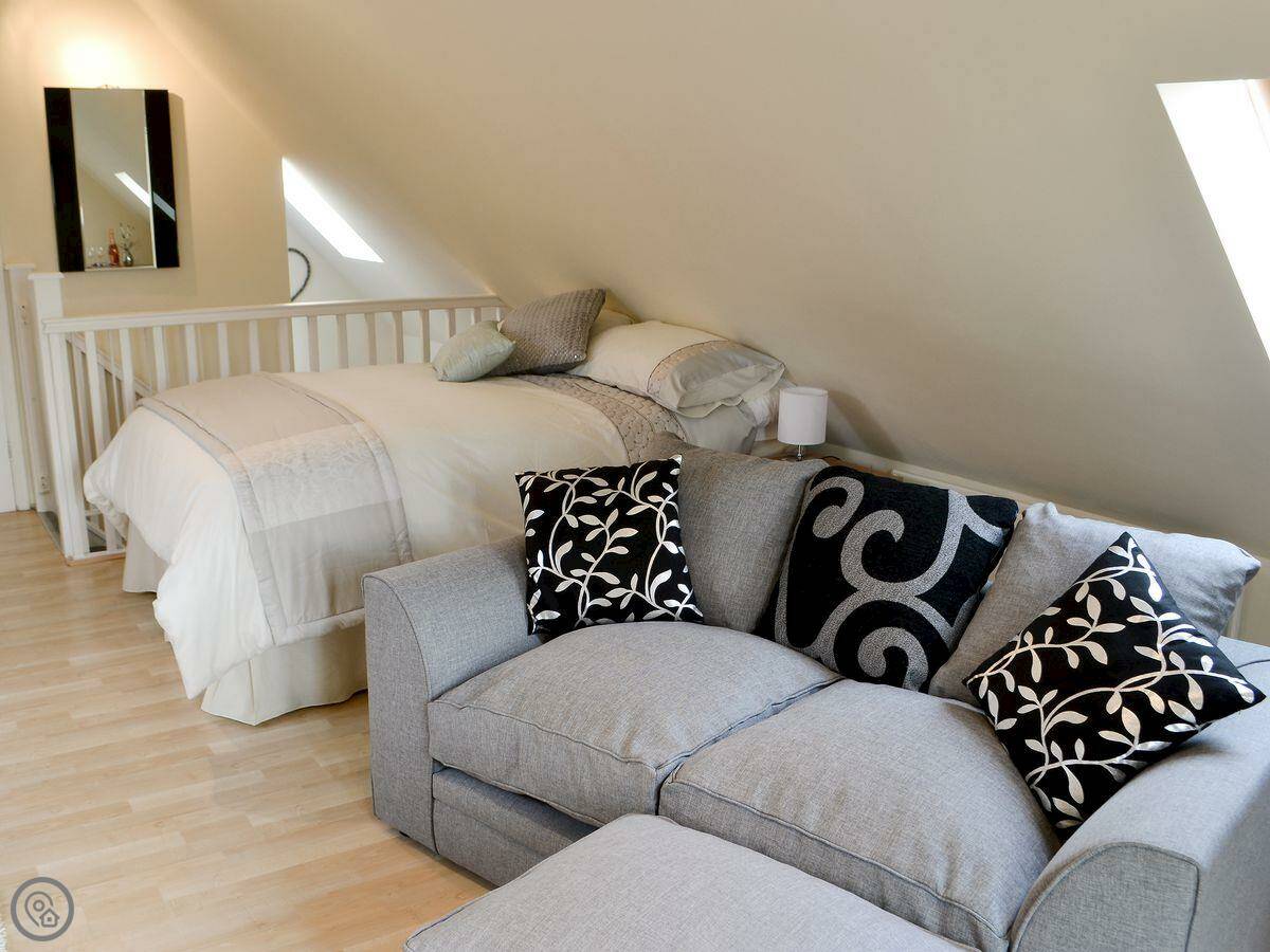 The Studio is in Warkworth. It's a detached building in our garden, but it's private. The front door opens straight into the kitchen. The stairs go up to the main room, which is a living area and the bed. It's all one space up there. It's for two people.
