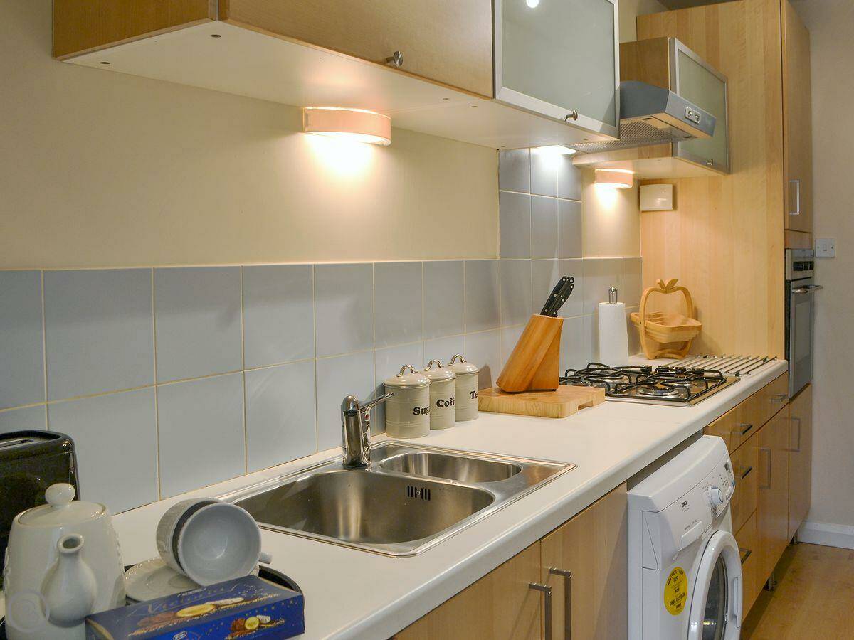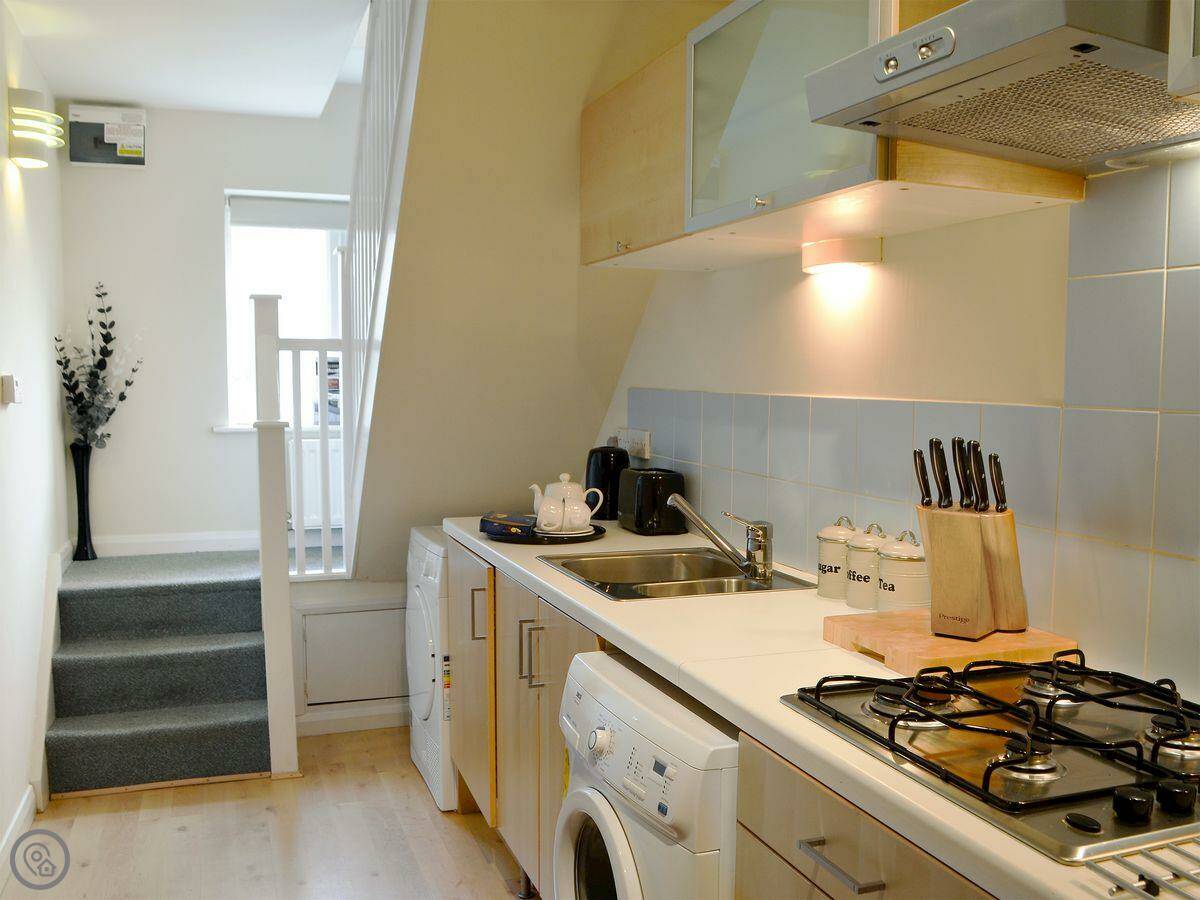 Inside, there's a small kitchen with a washing machine. Shower room is downstairs. TV and WiFi are included. All bedding and towels are provided.