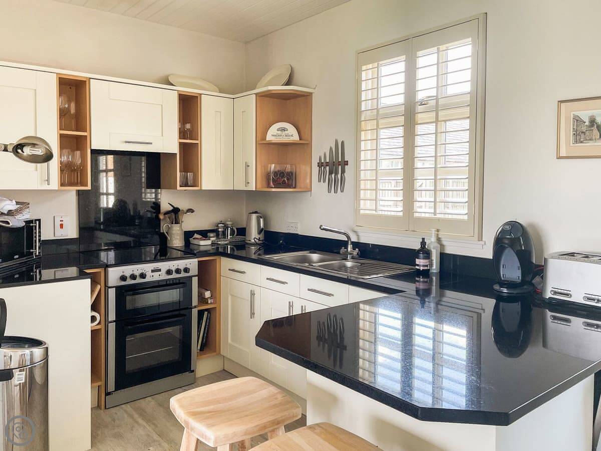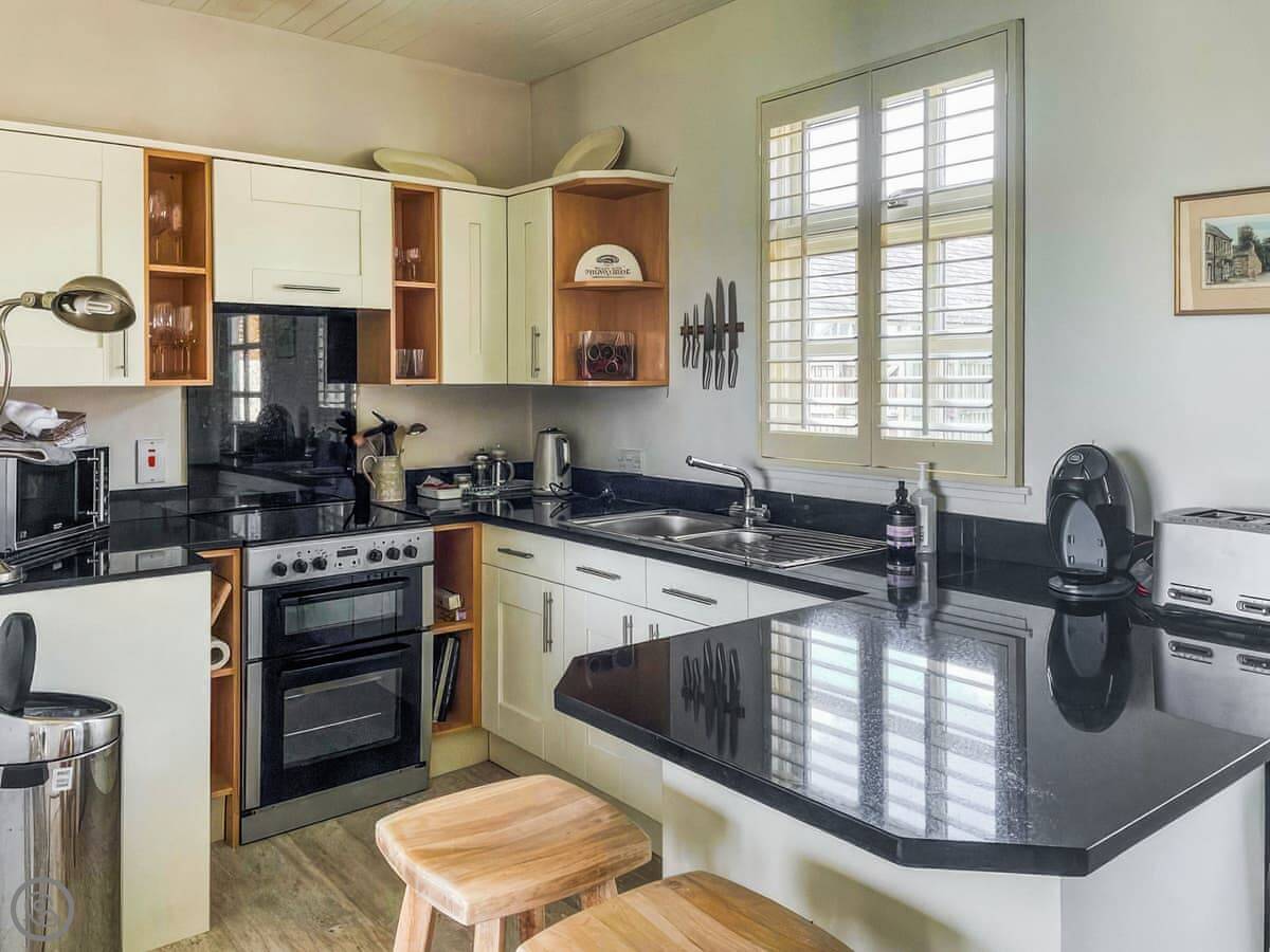 It sleeps two, with one bedroom and one bathroom. It's a 5 Star place. That means it's well-finished. There's underfloor heating and a woodburning stove. The bed is a zip-and-link, so it can be a super king or two twins.