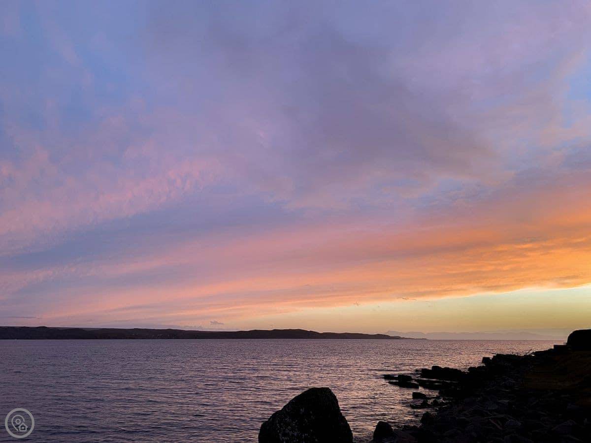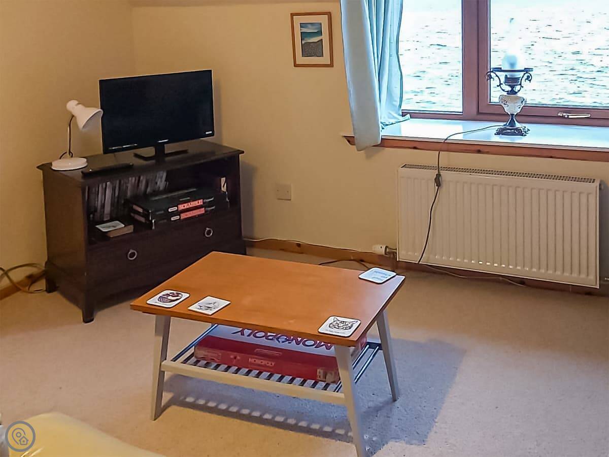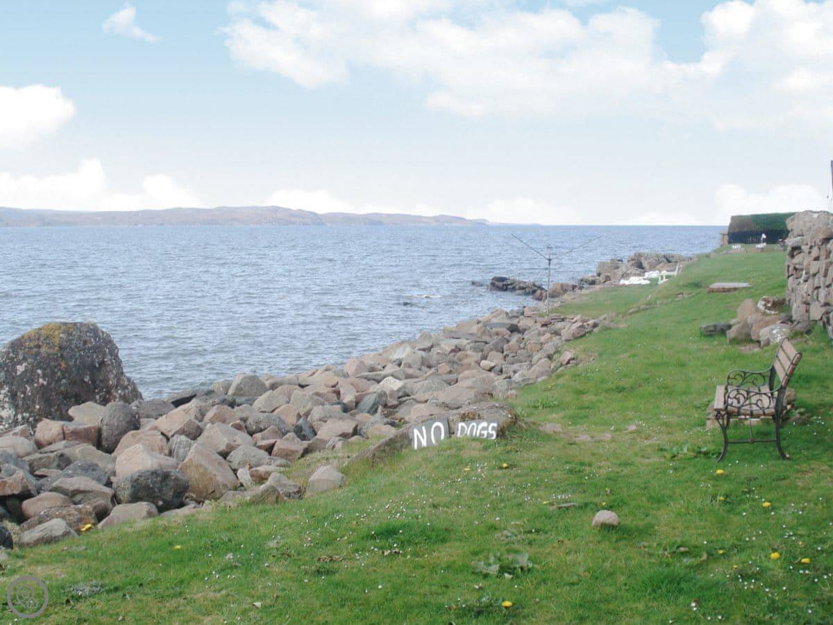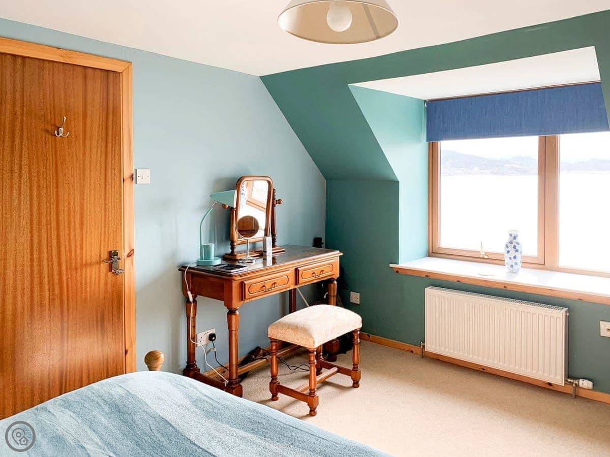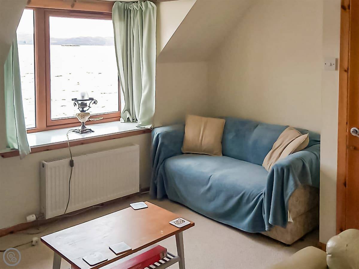 The upstairs living room is where you'll spend your time. It's got comfortable chairs and a sofa, and a great view out over the water to the hills and islands. You can see Skye from there. The double bedroom upstairs has a good view too. You can hear the waves. The front of the house catches the sun and is a proper suntrap. The sunsets over Skye are something else.