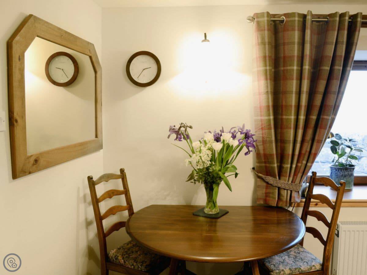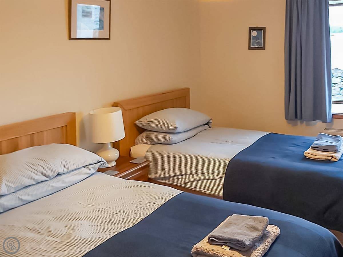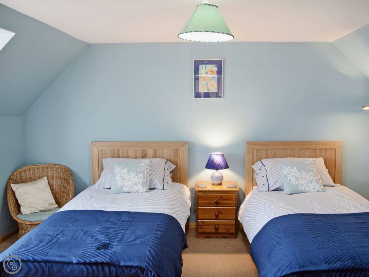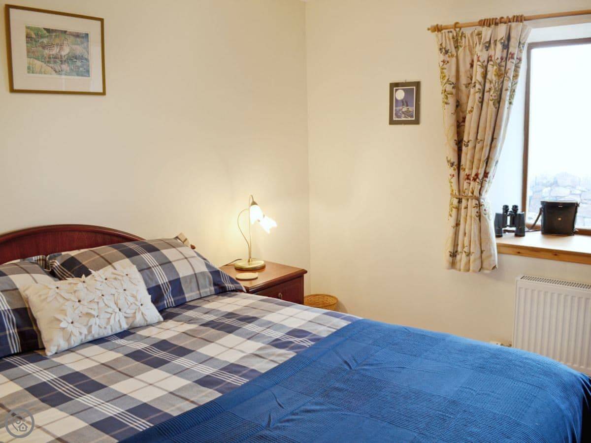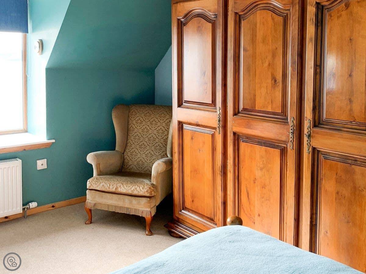 The upstairs living room is where you'll spend your time. It's got comfortable chairs and a sofa, and a great view out over the water to the hills and islands. You can see Skye from there. The double bedroom upstairs has a good view too. You can hear the waves. The front of the house catches the sun and is a proper suntrap. The sunsets over Skye are something else.