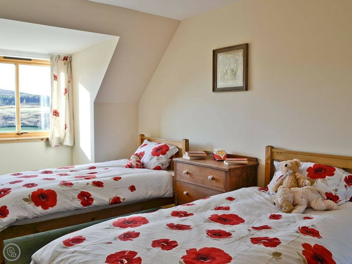 This is Mountain View, up in Tomintoul. It's detached, which means you get it to yourself. The back garden is enclosed and it looks straight out over fields to the Avonside hills. The view is pretty much what it says on the tin.