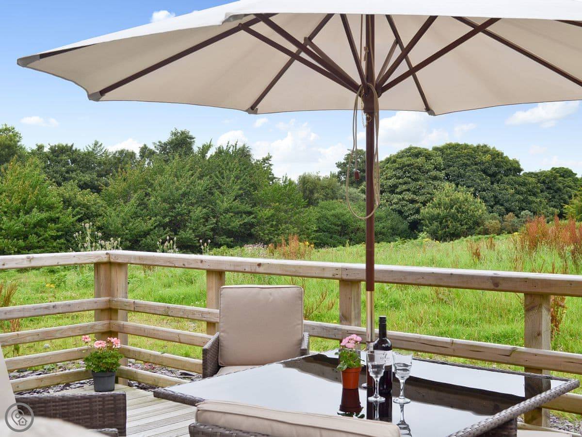 The front garden is a patio with a table, chairs, and a barbecue. It gets the sun in the afternoon. You're welcome to walk around the edges of our smallholding to see the chickens and sheep, but we'll leave you to yourselves unless you need something.
