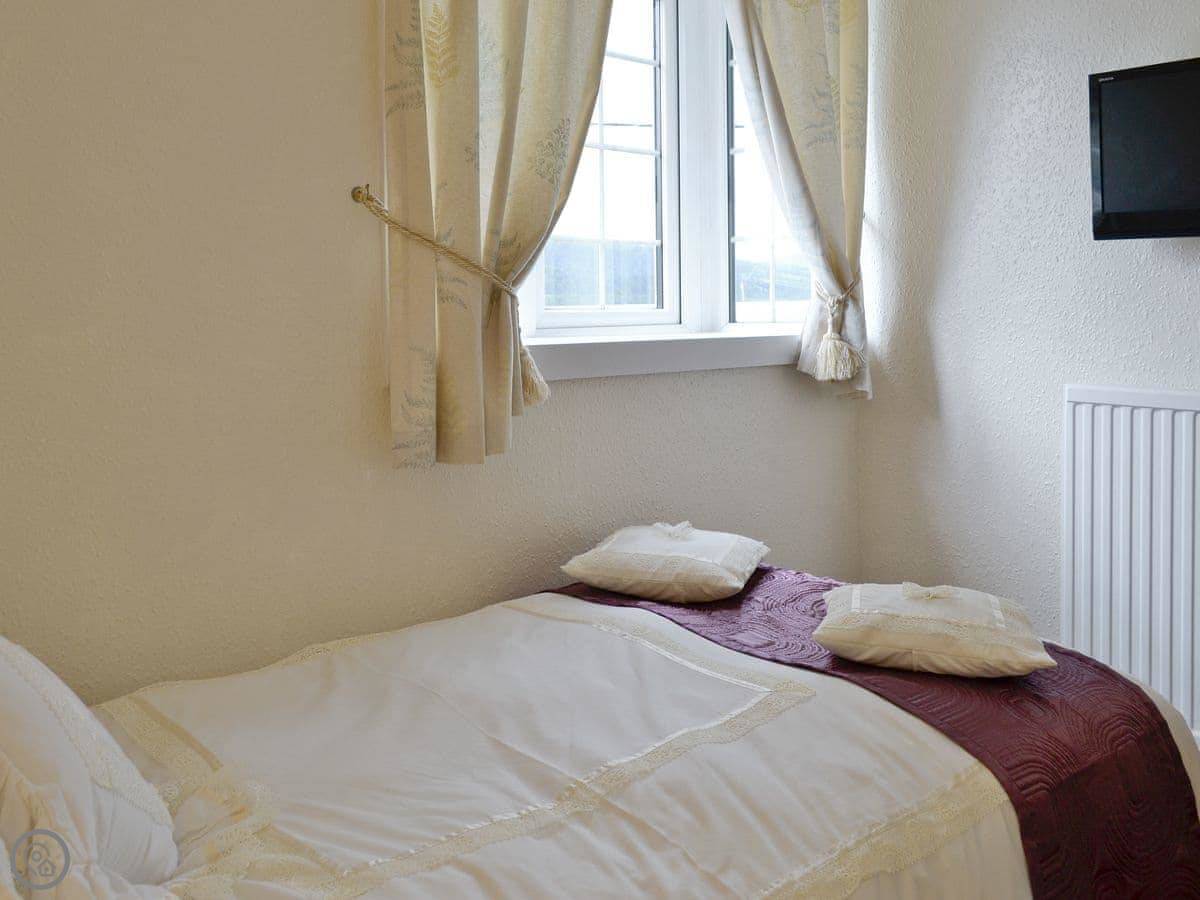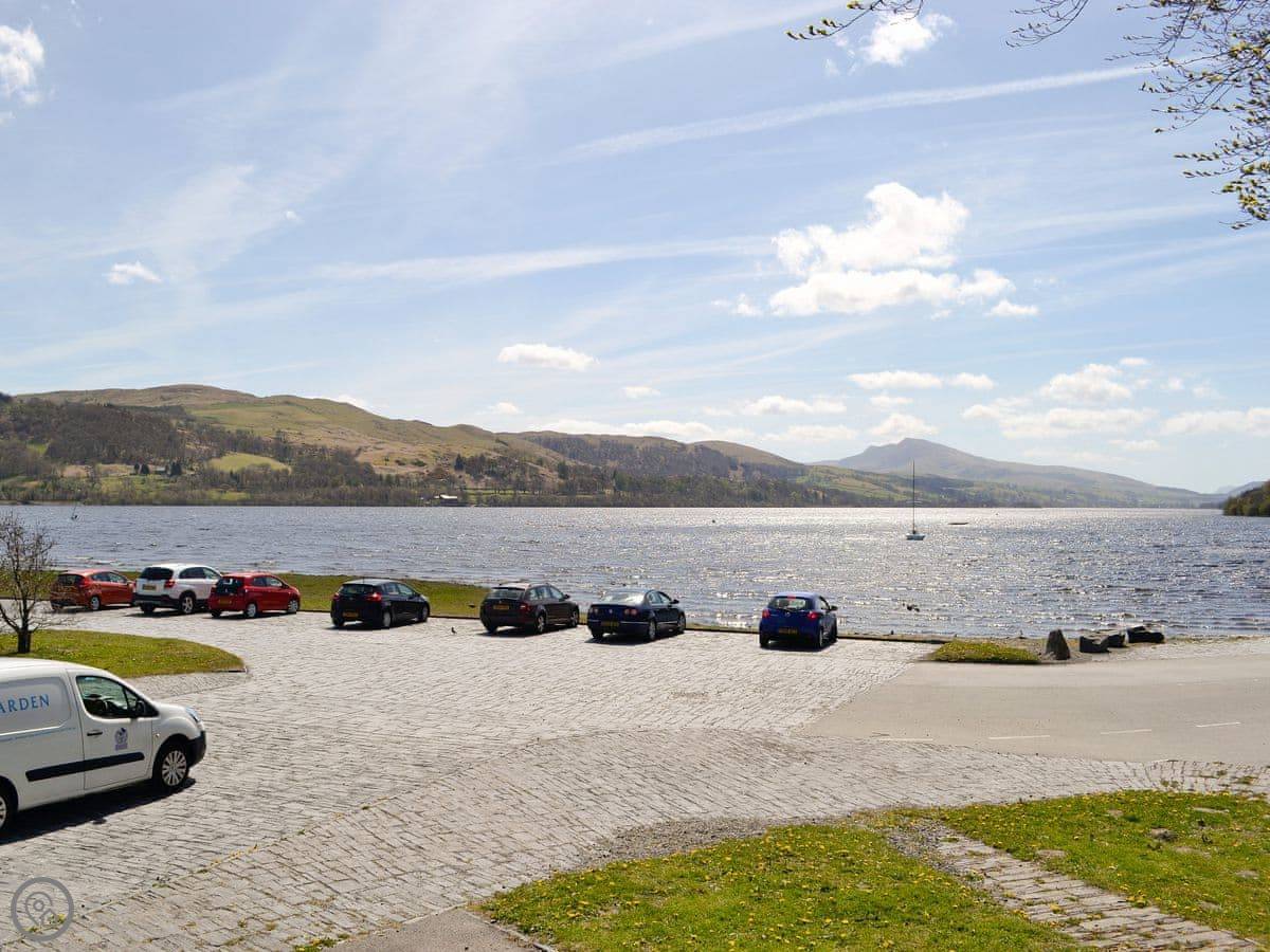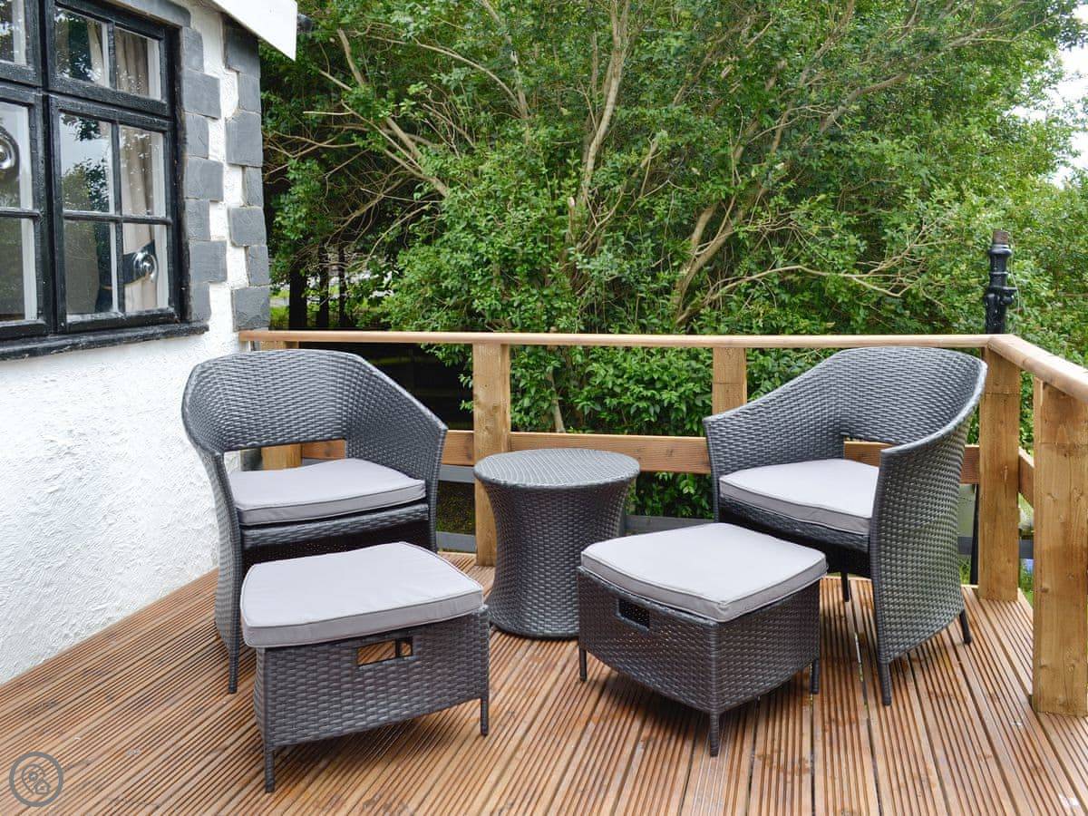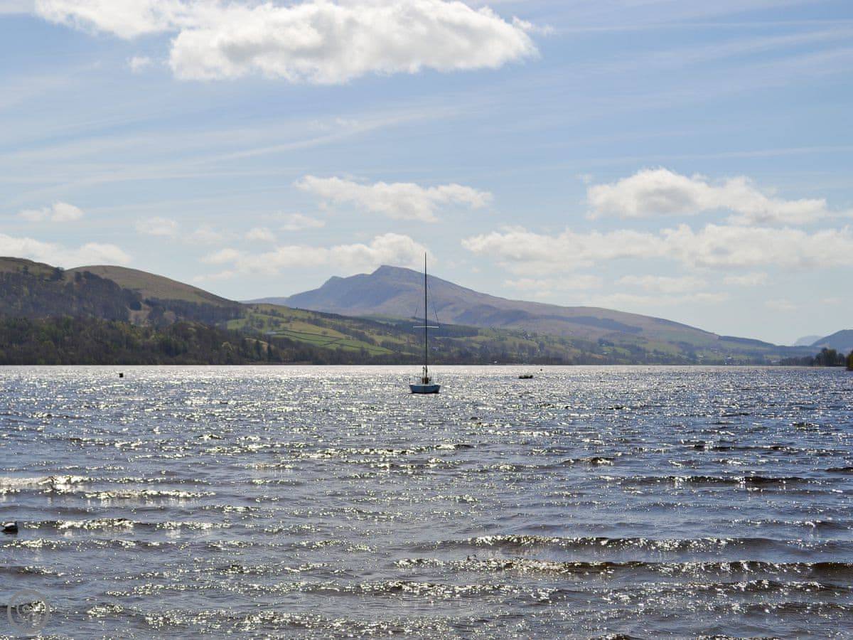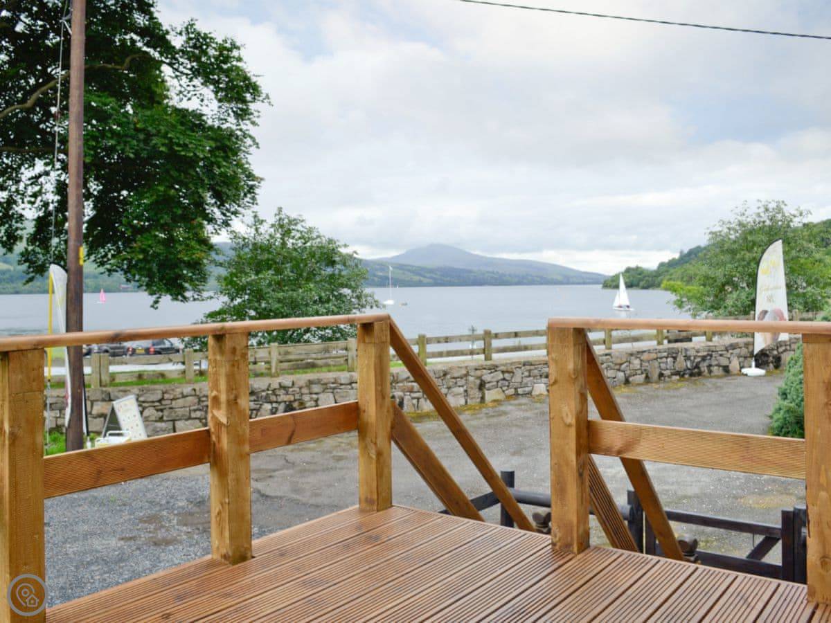 You've got your own decked area out the back. That's the main event, really. You sit out there with a drink and just look at the lake. It's a proper view. We run a coffee shop next door in the season, so you can pop in for a coffee and a cake.